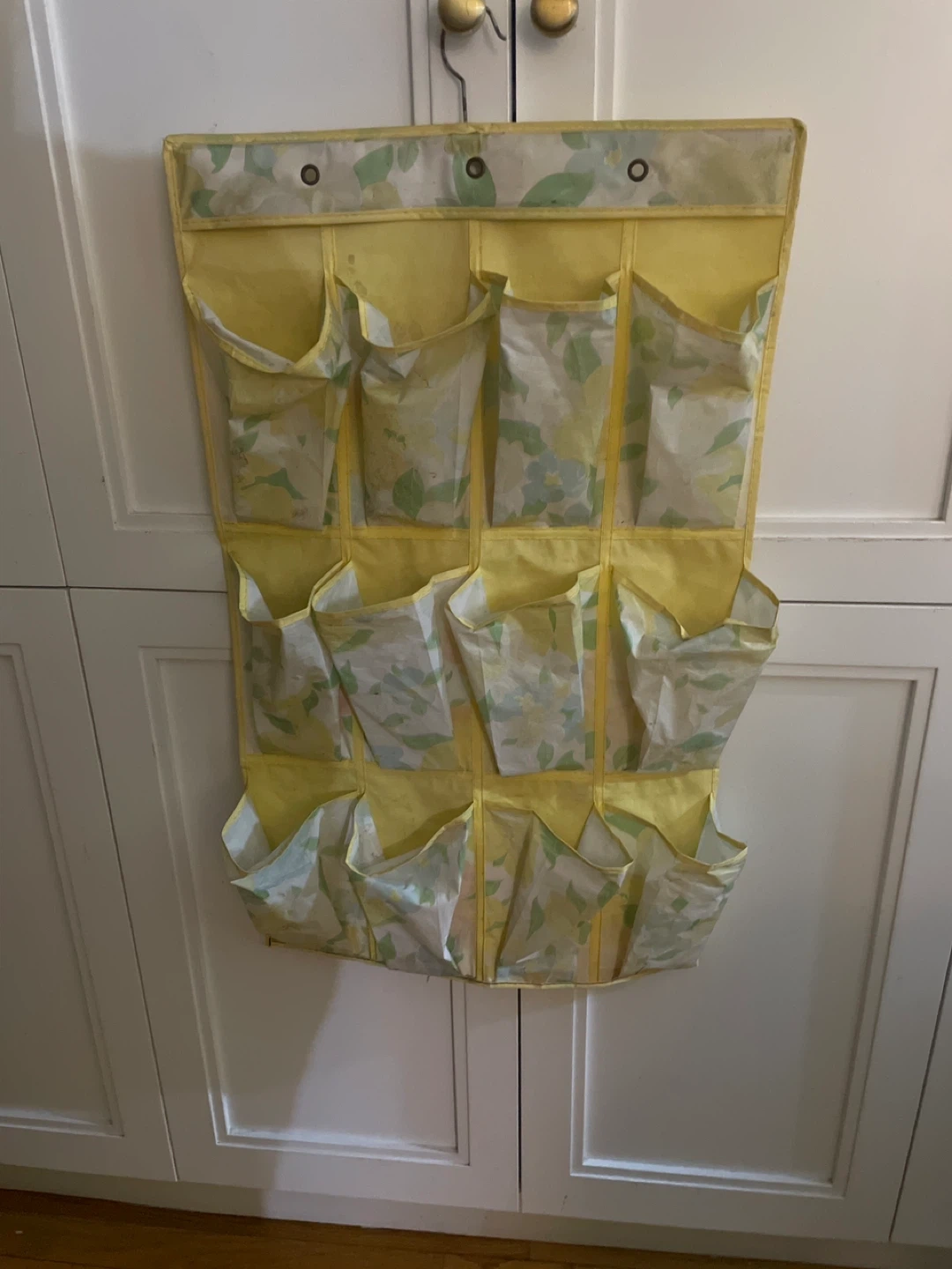 Here's a yellow and floral hanging shoe organizer! It has multiple pockets to keep your shoes tidy and off the floor