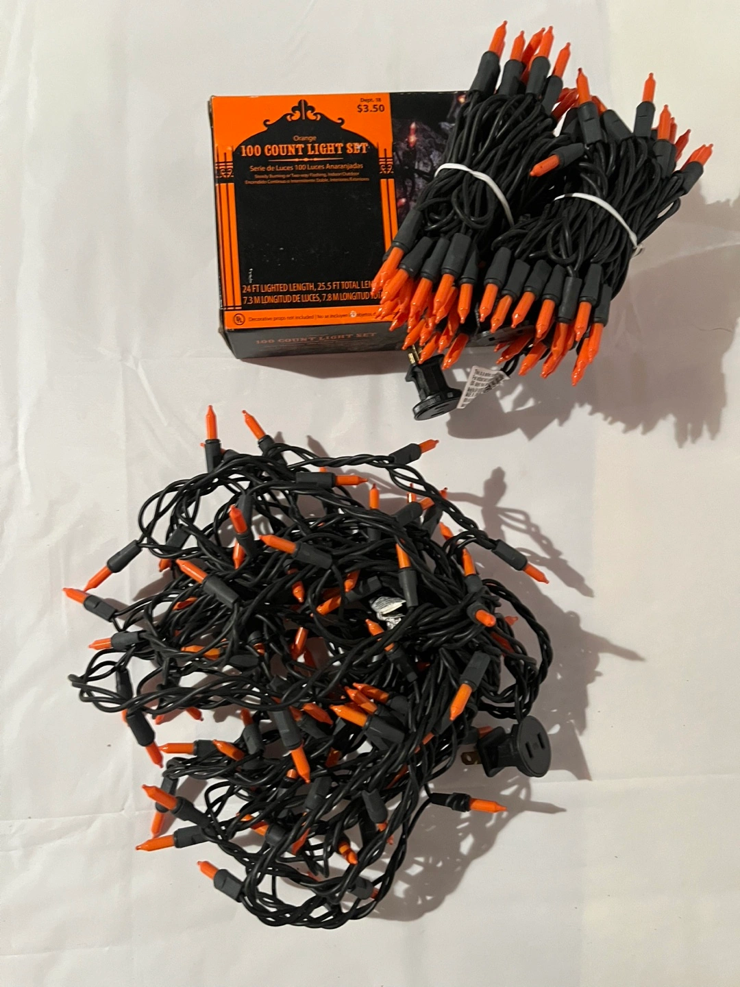 Get ready for Halloween with these orange string lights! They have a black cord and 100 lights per set. Perfect for decorating your home for the spooky season!