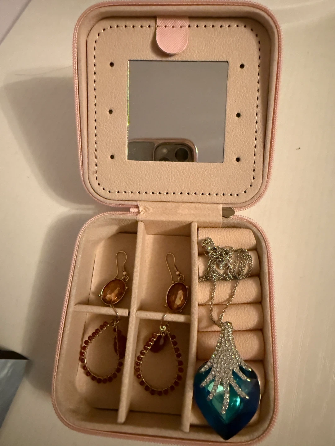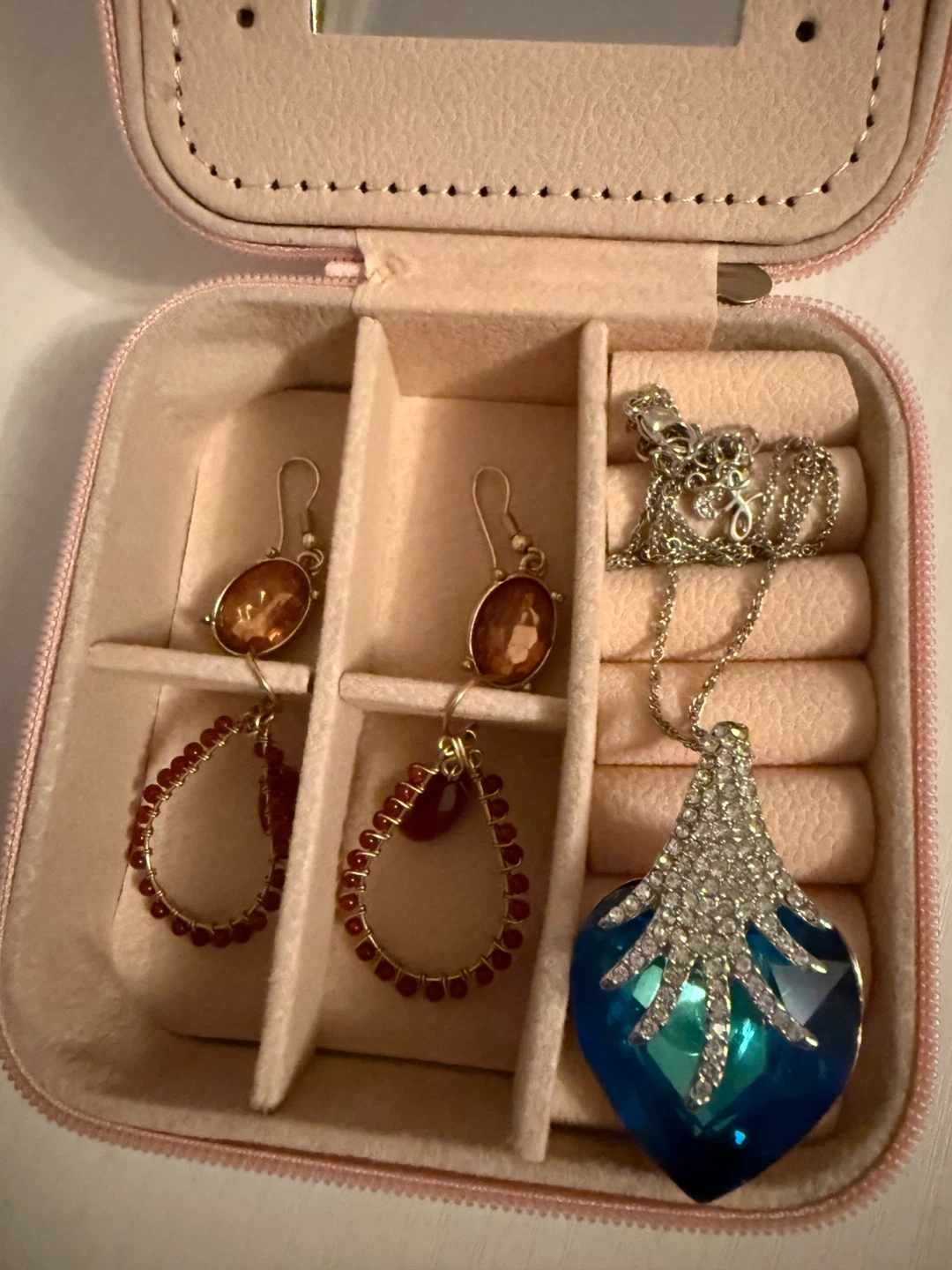 This is a cute pink travel jewelry box with two set of earrings and a beautiful necklace in it!It has a mirror inside and is perfect for storing your earrings and necklaces while on the go🥕