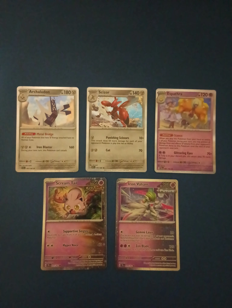 Selling a collection of Pokemon trading cards! Includes Archaludon, Scizor, Espathra, Scream Tail, and Iron Valiant. All in good condition and ready for a new home
