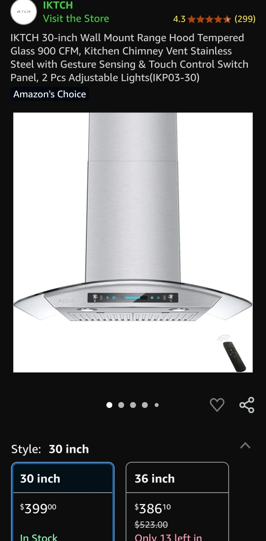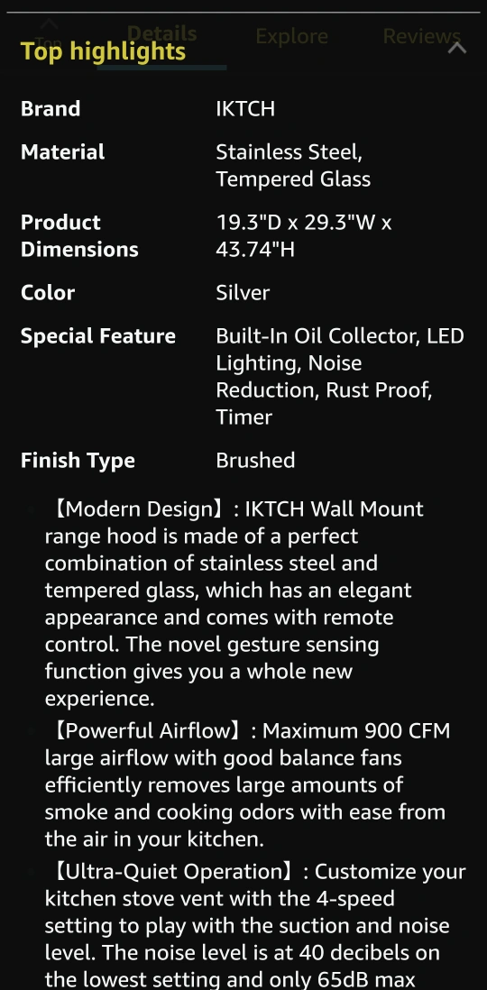 I'm selling a brand new IKTCH 30-inch wall mount range hood. It's still in the original packaging and has never been used! Key features: - Made of stainless steel and tempered glass - Dimensions: 19.3"D x 29.3"W x 43.74"H - Silver color with a brushed finish - Built-in oil collector, LED lighting, noise reduction, rust proof, and timer - Maximum 900 CFM large airflow - Gesture sensing function