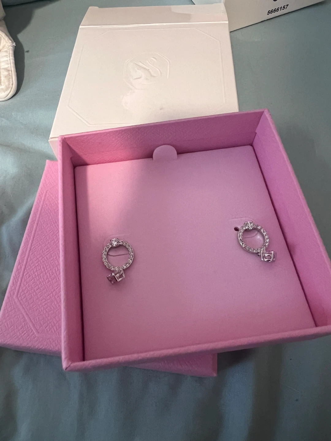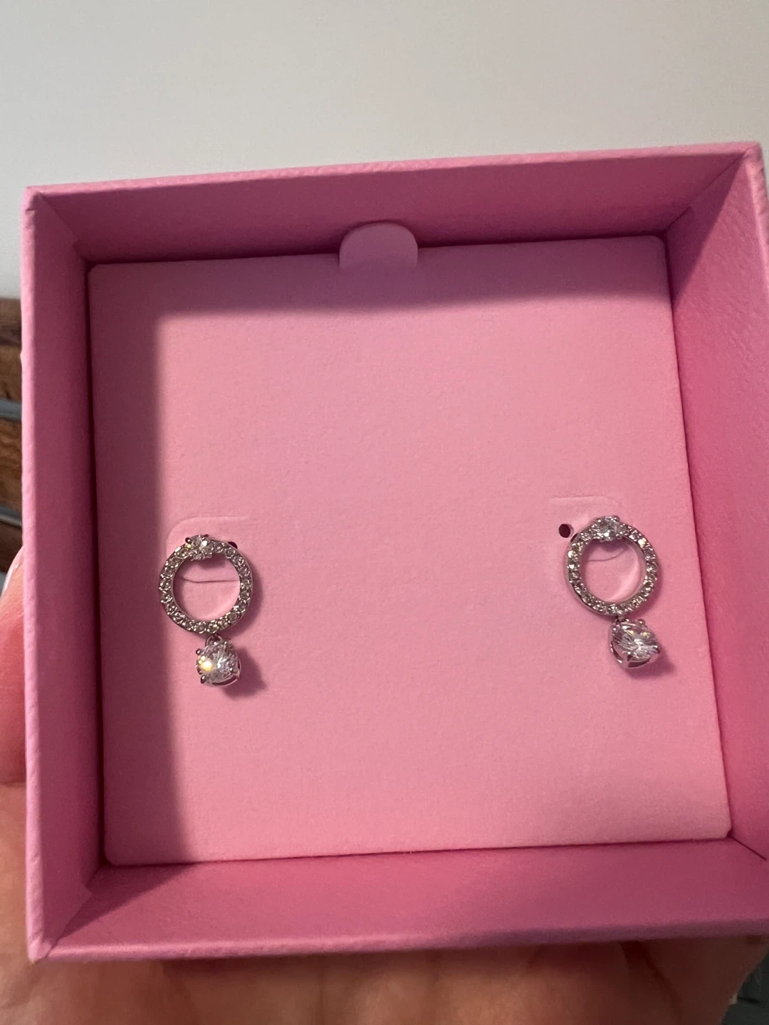Selling a pair of Swarovski Circle drop earrings. They are silver in color and come with the original boxes.