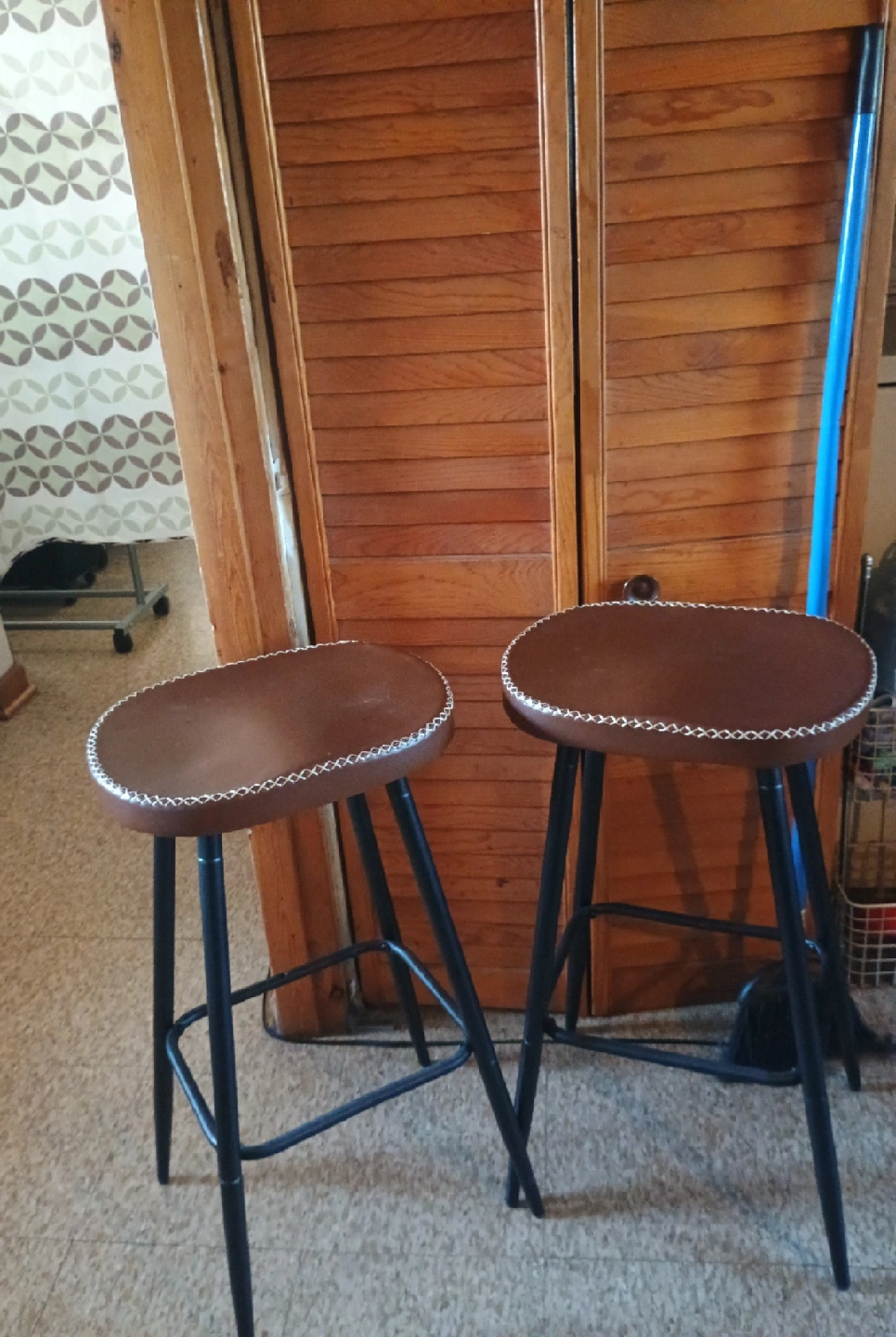 Selling a set of two bar stools! They have a brown seat with white stitching and black legs. These stools are in great condition and would look great in any kitchen or bar area