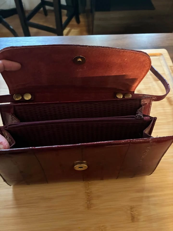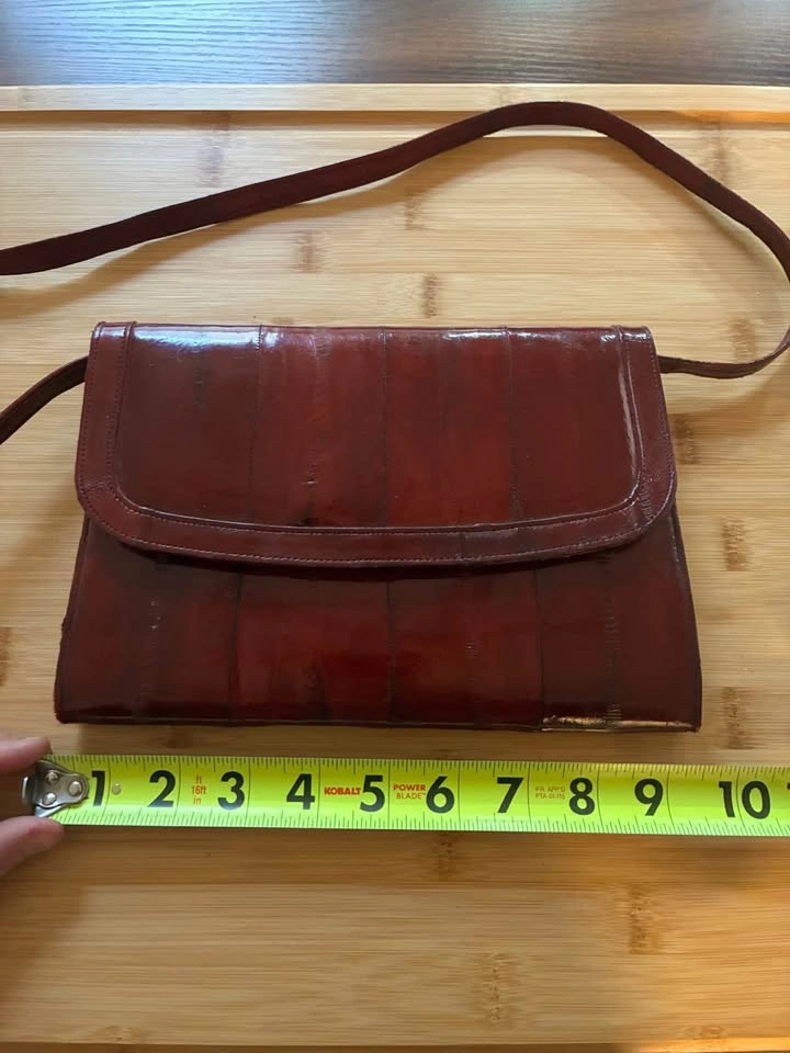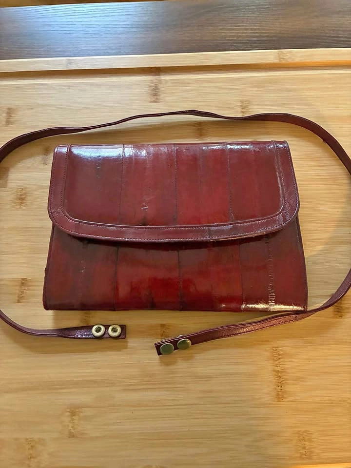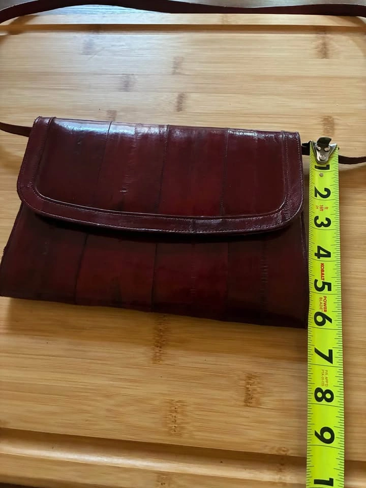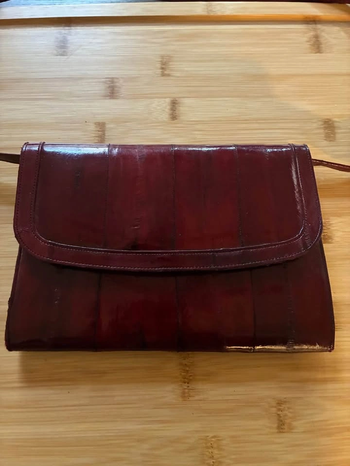 Gorgeous burgundy eel skin handbag with detachable 39in strap. Can be worn crossbody, over the shoulder, or as a clutch. Authentic snake skin- feels like butter!