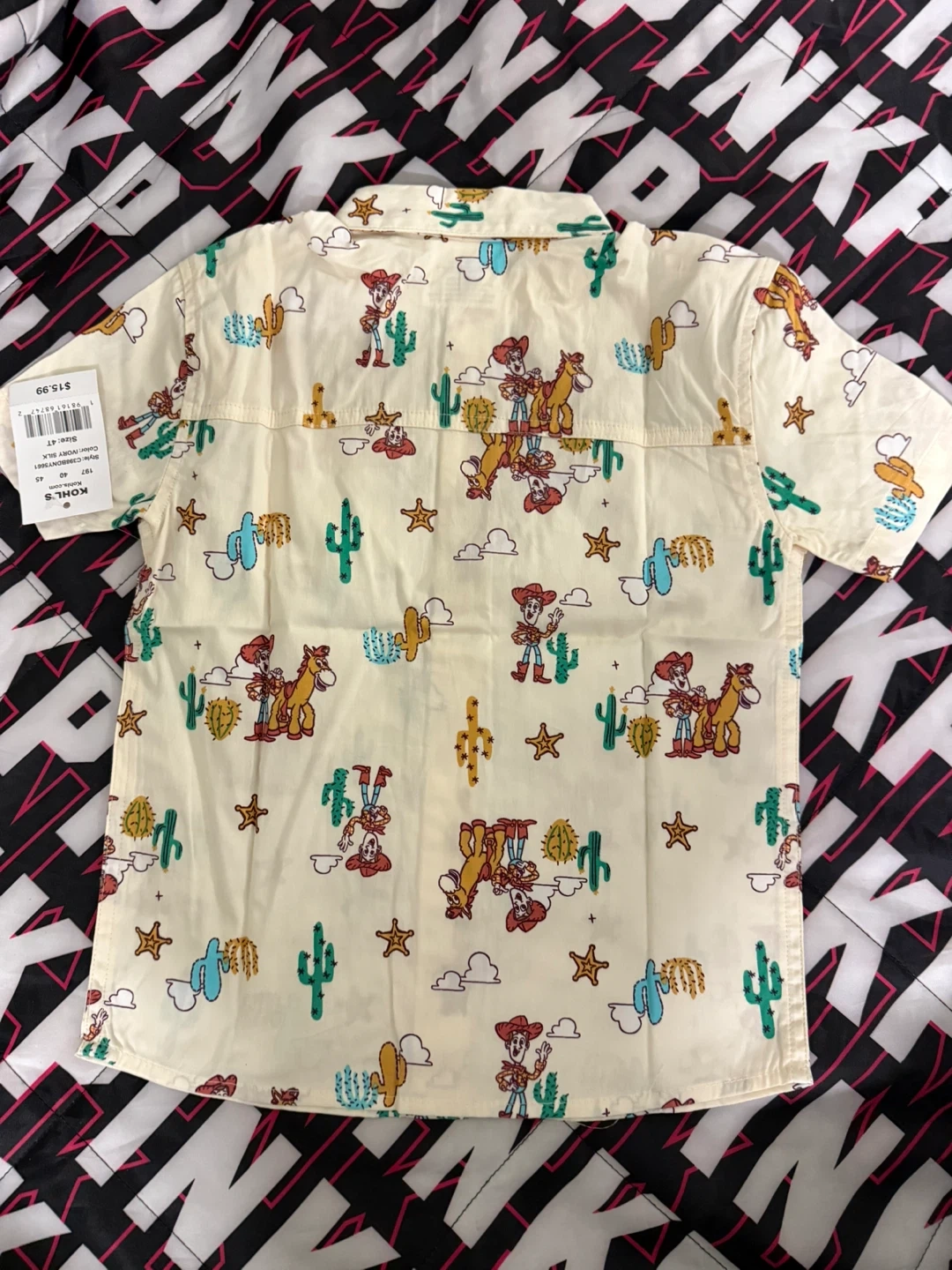 This cute Toy Story button-down shirt is perfect for your little one! It features a fun all-over print with Woody and other Toy Story characters, along with cacti and stars. The shirt is size 4T and in great condition. Originally bought for $15.99