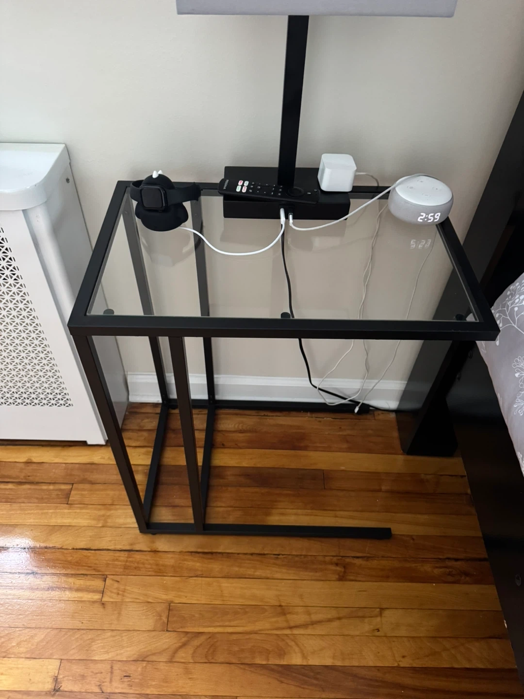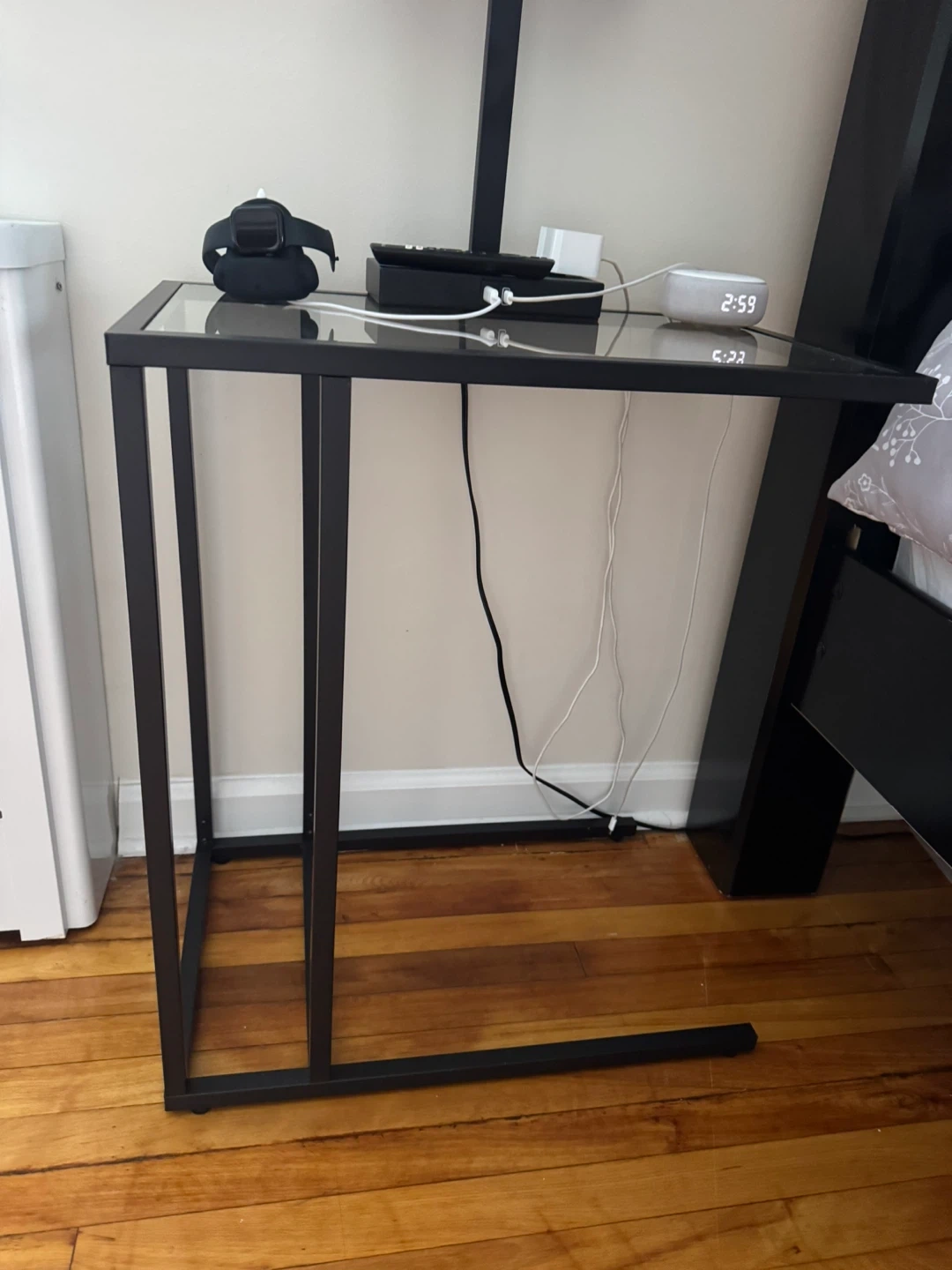 Selling a sleek, black C-shaped end table! It features a glass top and a modern design. It's perfect for small spaces and can easily slide under sofas or chairs. Great for holding drinks, books, or your electronics