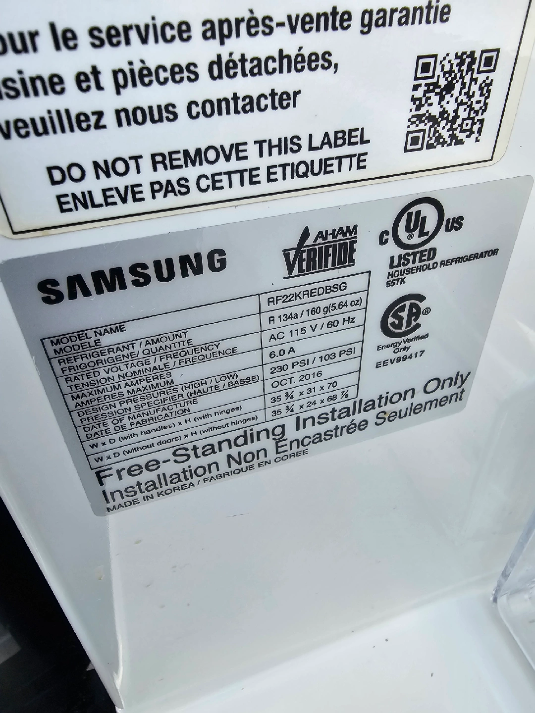 Selling a Samsung refrigerator, model number RF22KREDB. It's a free-standing installation. The refrigerator uses R 134a refrigerant and operates at AC 115 V / 60 Hz. Dimensions are 35 3/4 x 24 x 68 7/8 inches