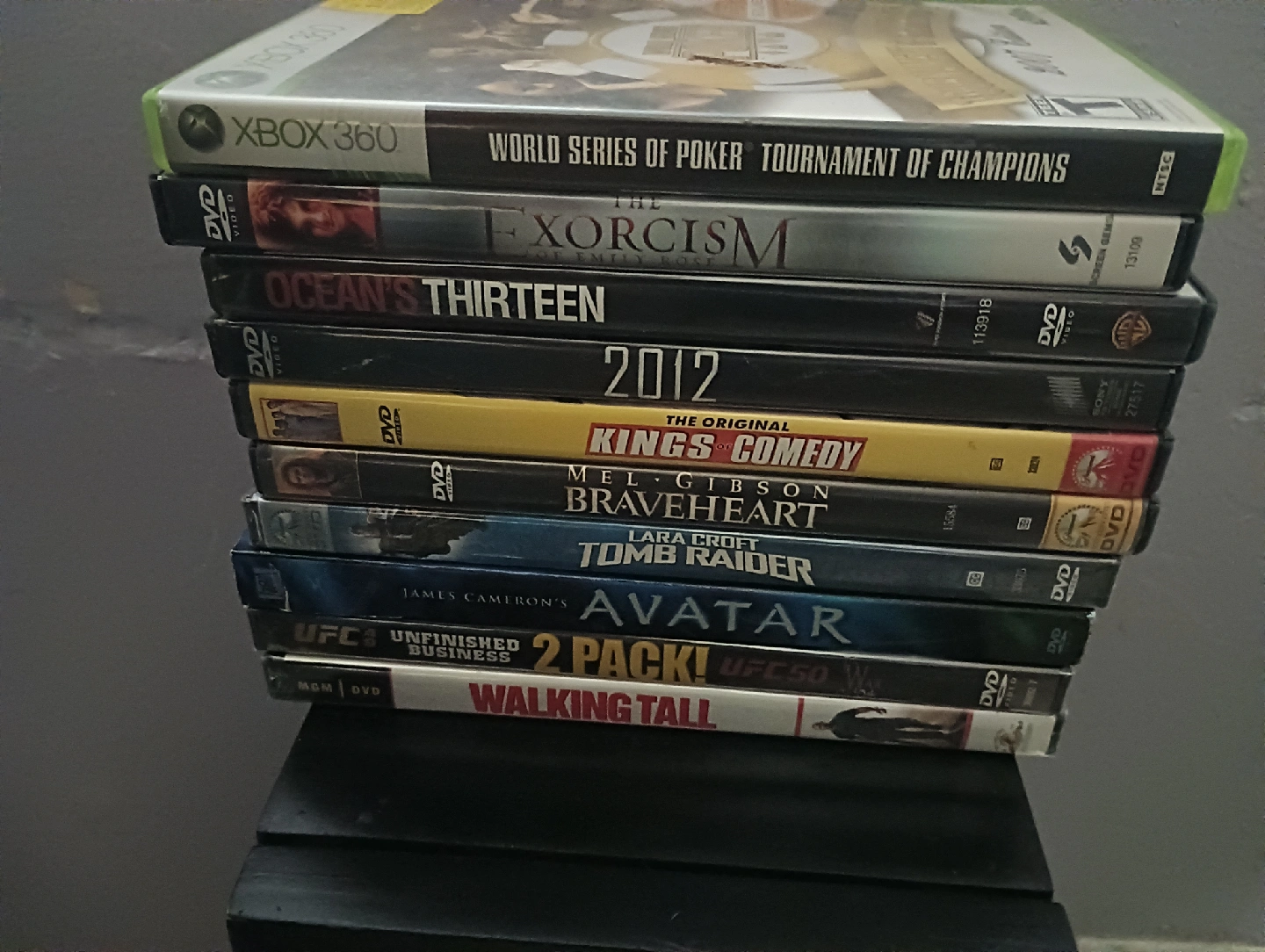 Selling a collection of DVDs. Includes movies like T2, Tron, The Astronaut's Wife, Looney Tunes: Back in Action, Kings of Comedy, Braveheart, Tomb Raider, Avatar, and more! Also includes some anime DVDs and a few Xbox 360 games.