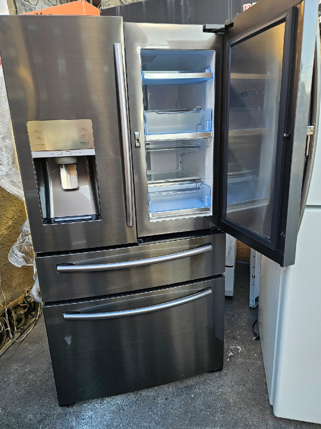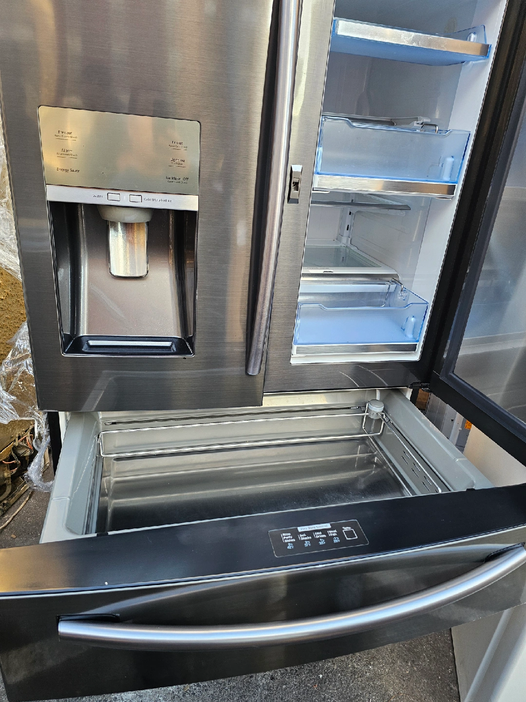Selling a Samsung 4-Door French Door Refrigerator in black stainless steel. It’s in good working condition and ready for a new home. Perfect for any kitchen!
