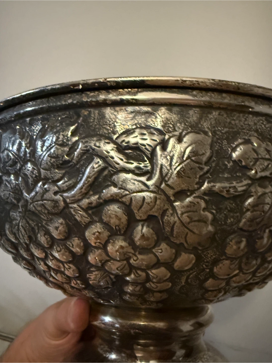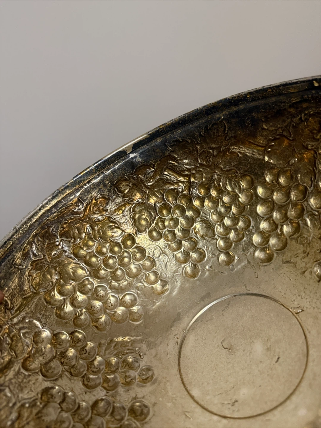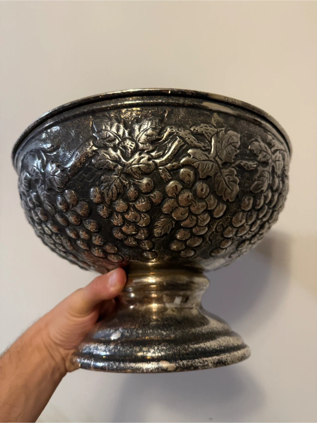 Here's a vintage silver plated bowl featuring a beautiful grape design. It's perfect for adding a touch of elegance to your home decor. The bowl shows some signs of wear consistent with its age, but it's still a stunning piece!