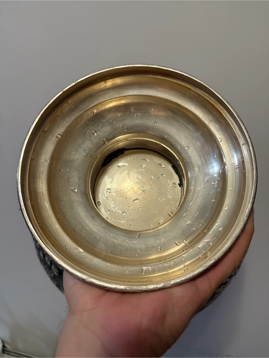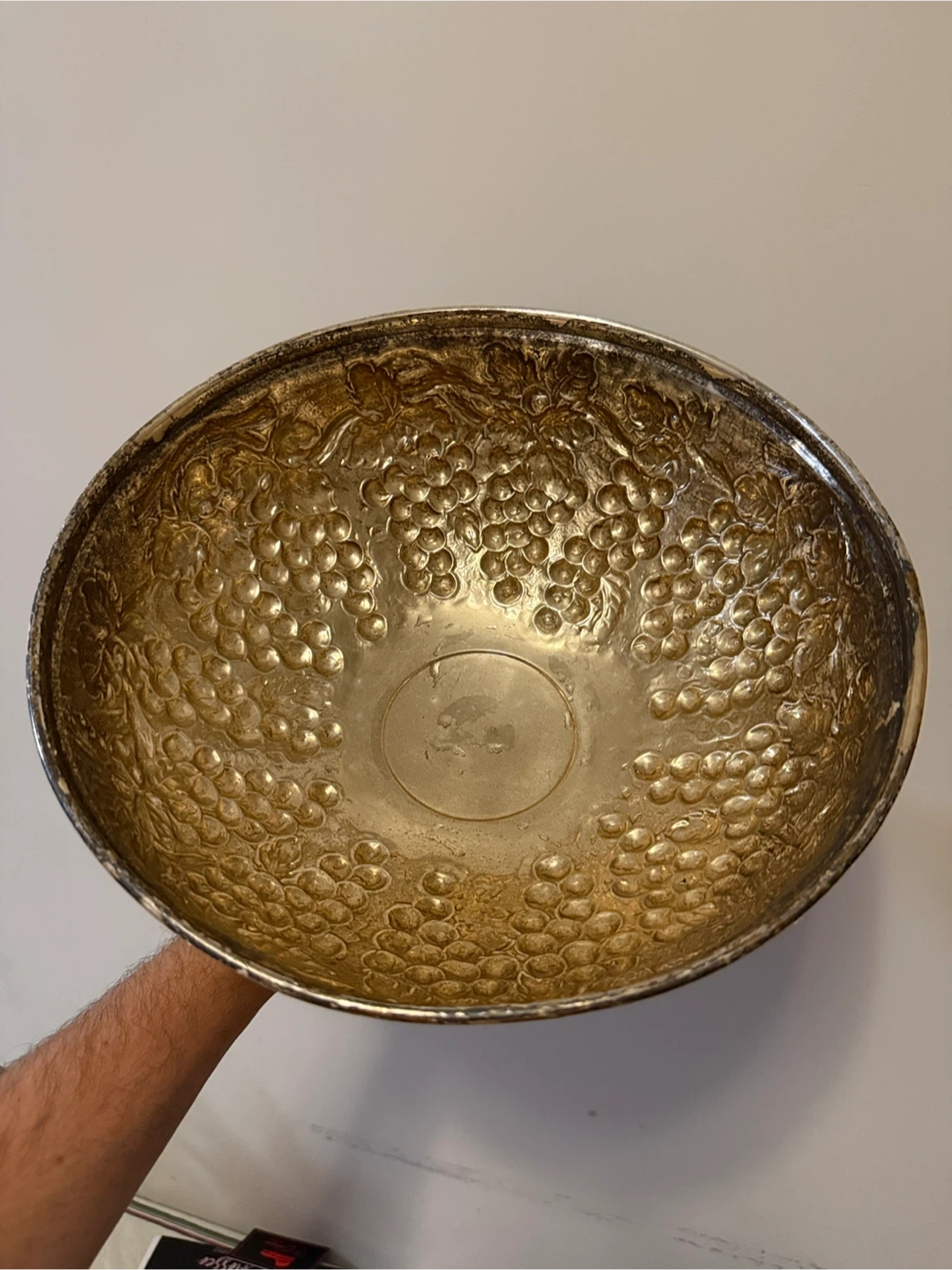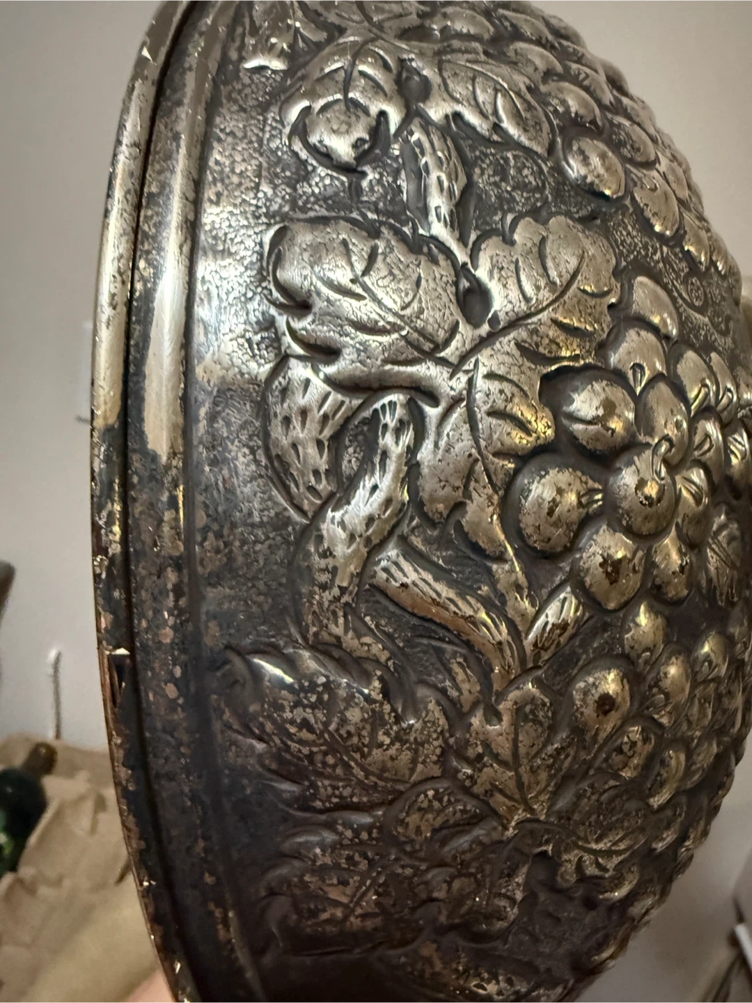 Here's a vintage silver plated bowl featuring a beautiful grape design. It's perfect for adding a touch of elegance to your home decor. The bowl shows some signs of wear consistent with its age, but it's still a stunning piece!