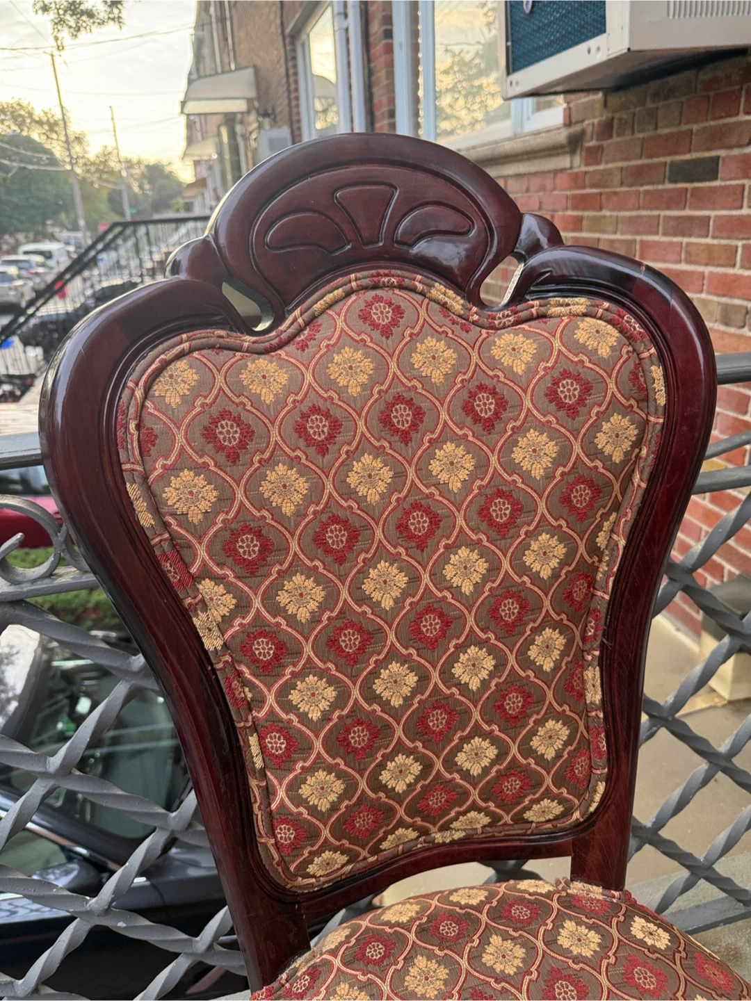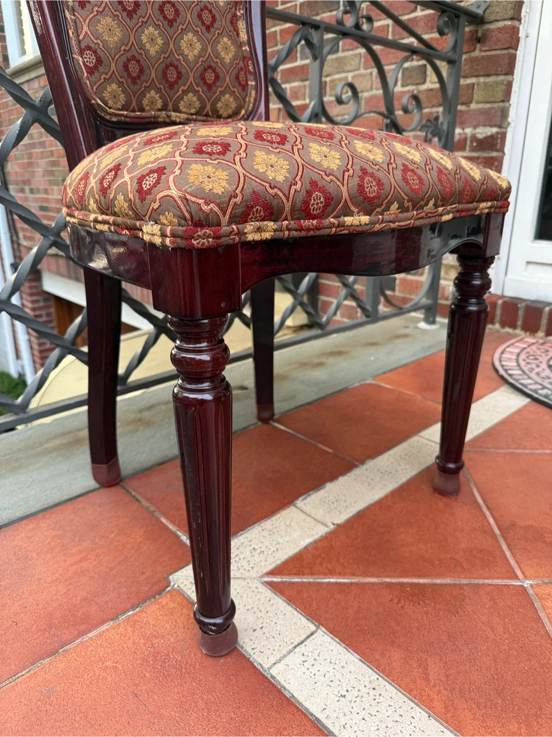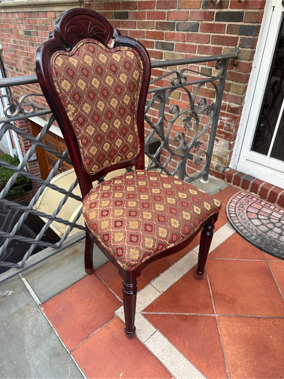 Selling a unique accent chair with a beautiful, patterned fabric seat and back. The chair has a dark wood frame and ornate detailing. It would make a lovely addition to any room!