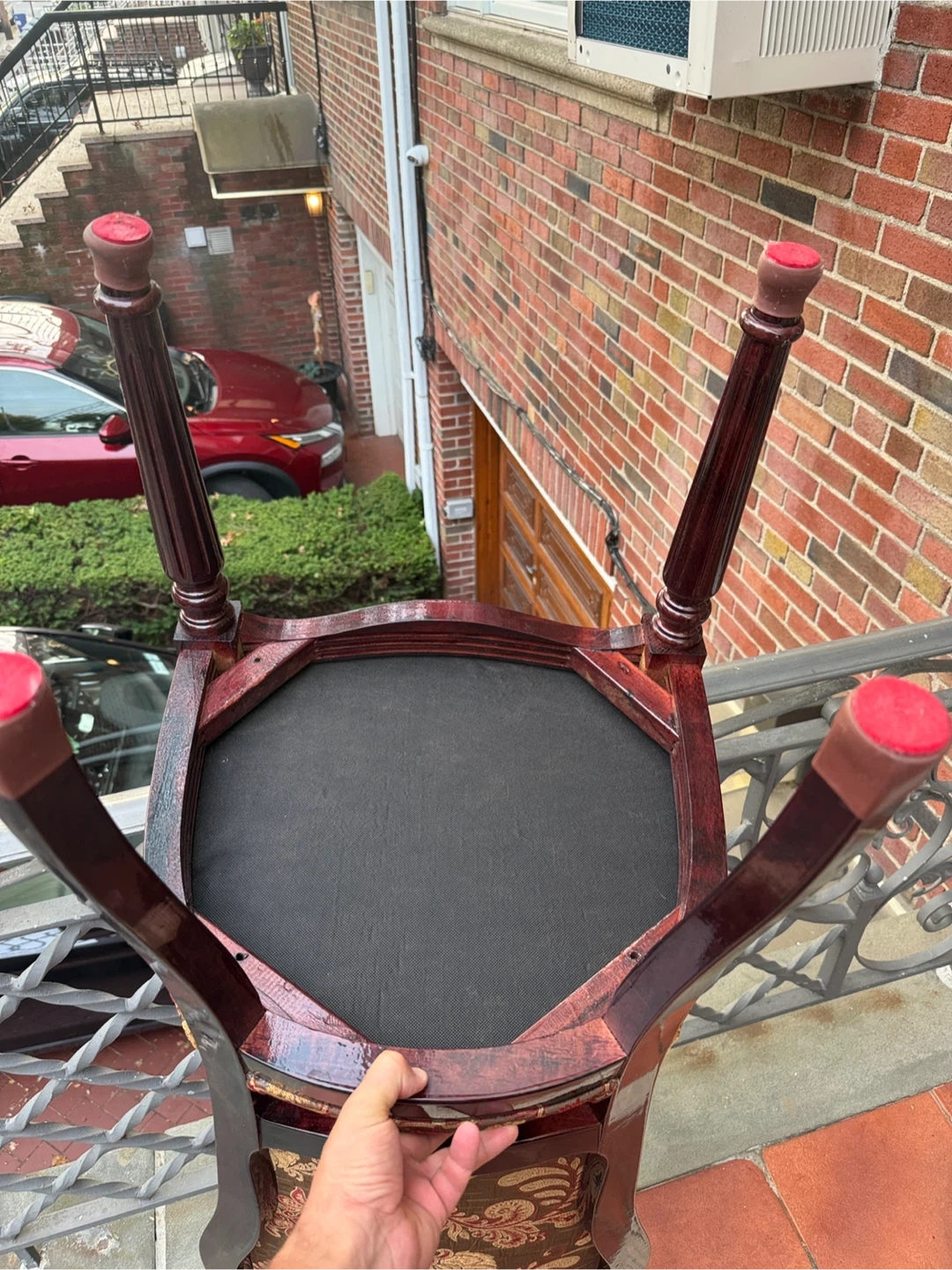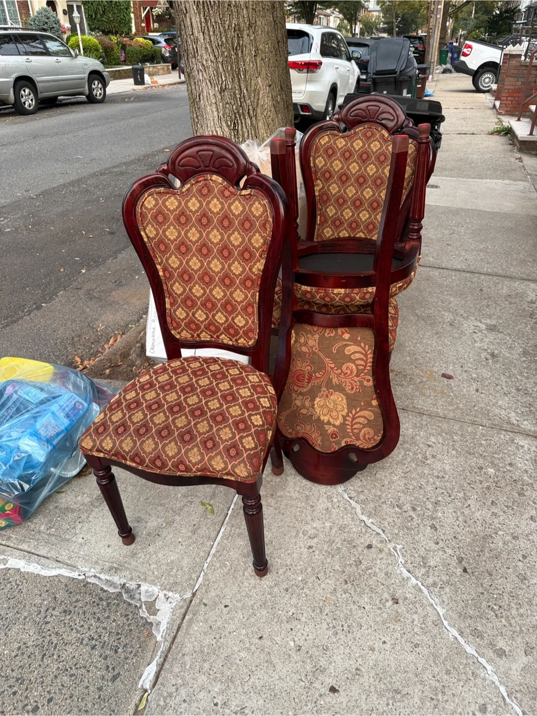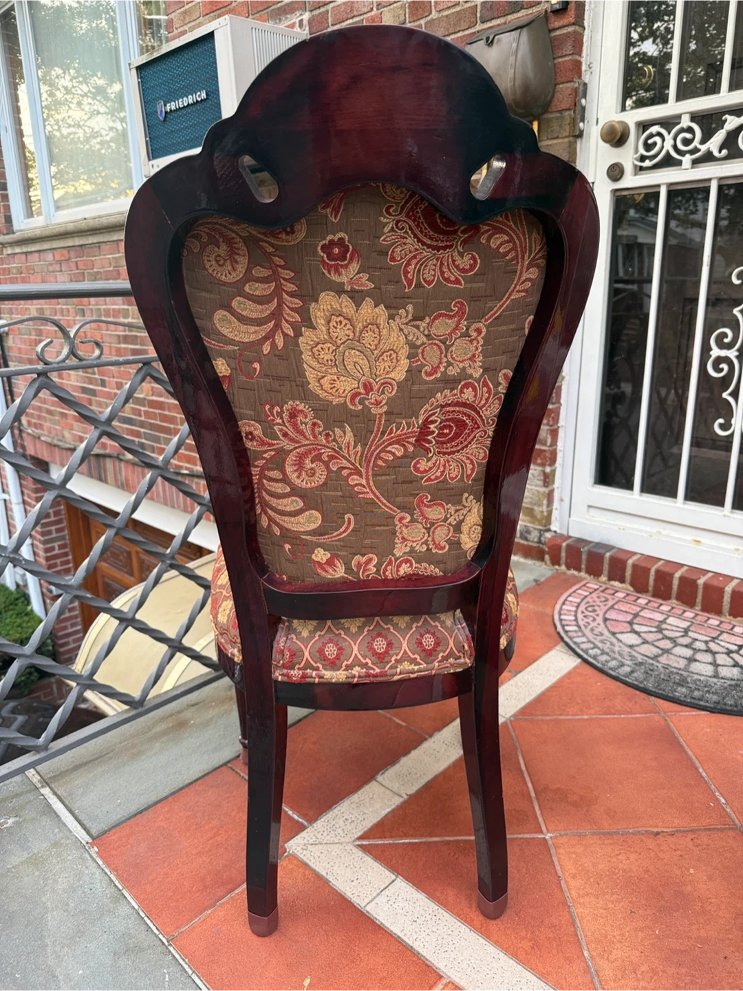 Selling a unique accent chair with a beautiful, patterned fabric seat and back. The chair has a dark wood frame and ornate detailing. It would make a lovely addition to any room!