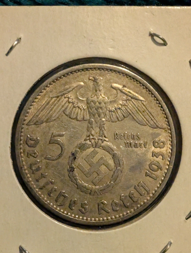 1938 5 Reich Mark authentic WW 2 - 5 mark German coin 90% silver is in excellent condition