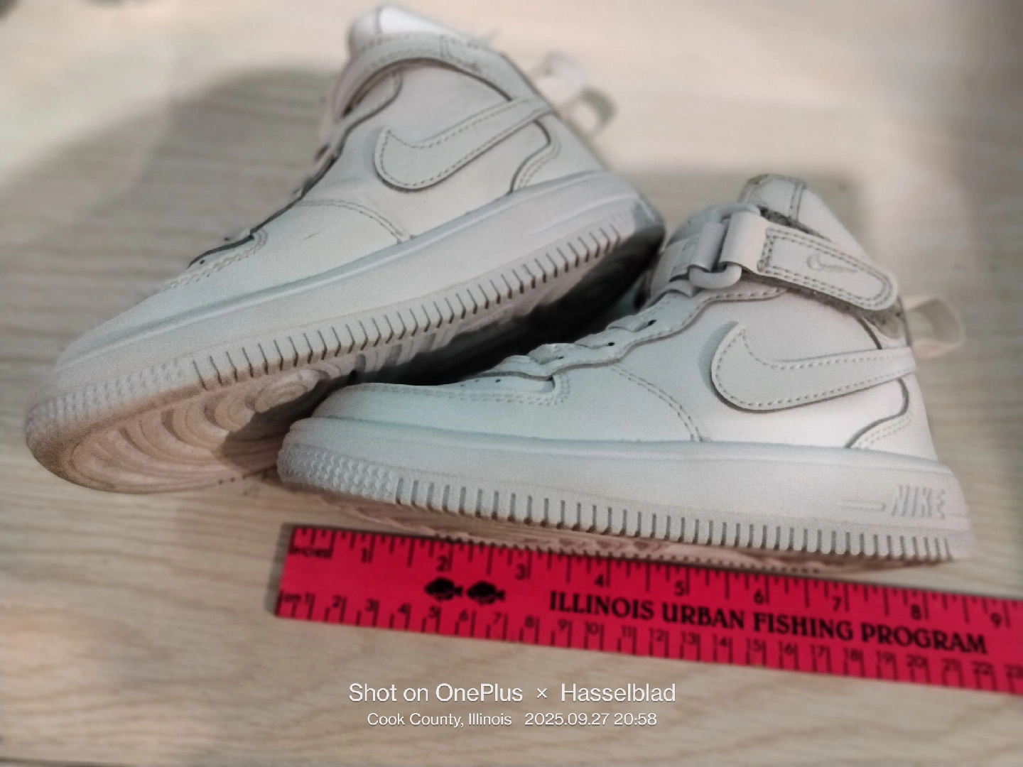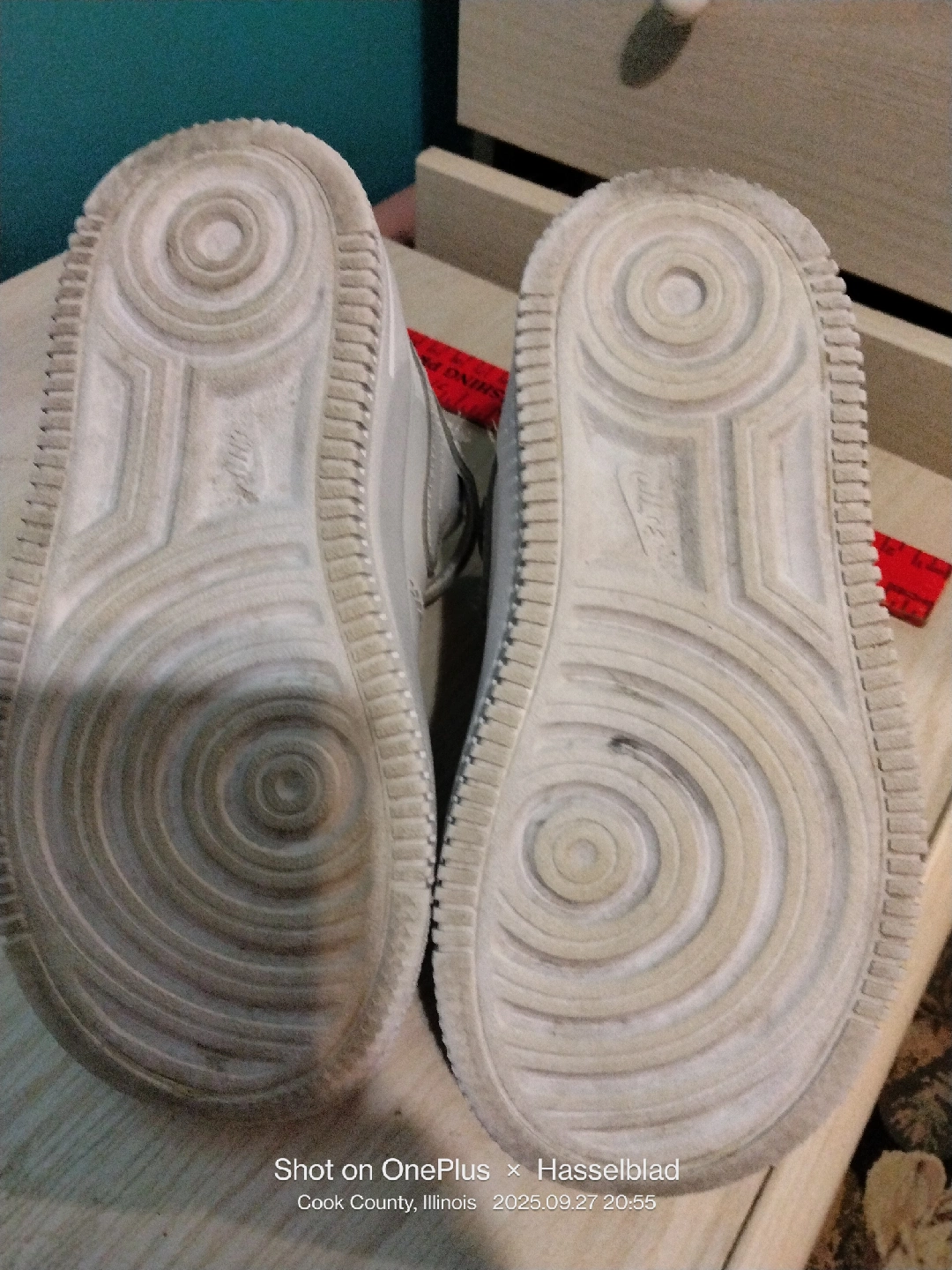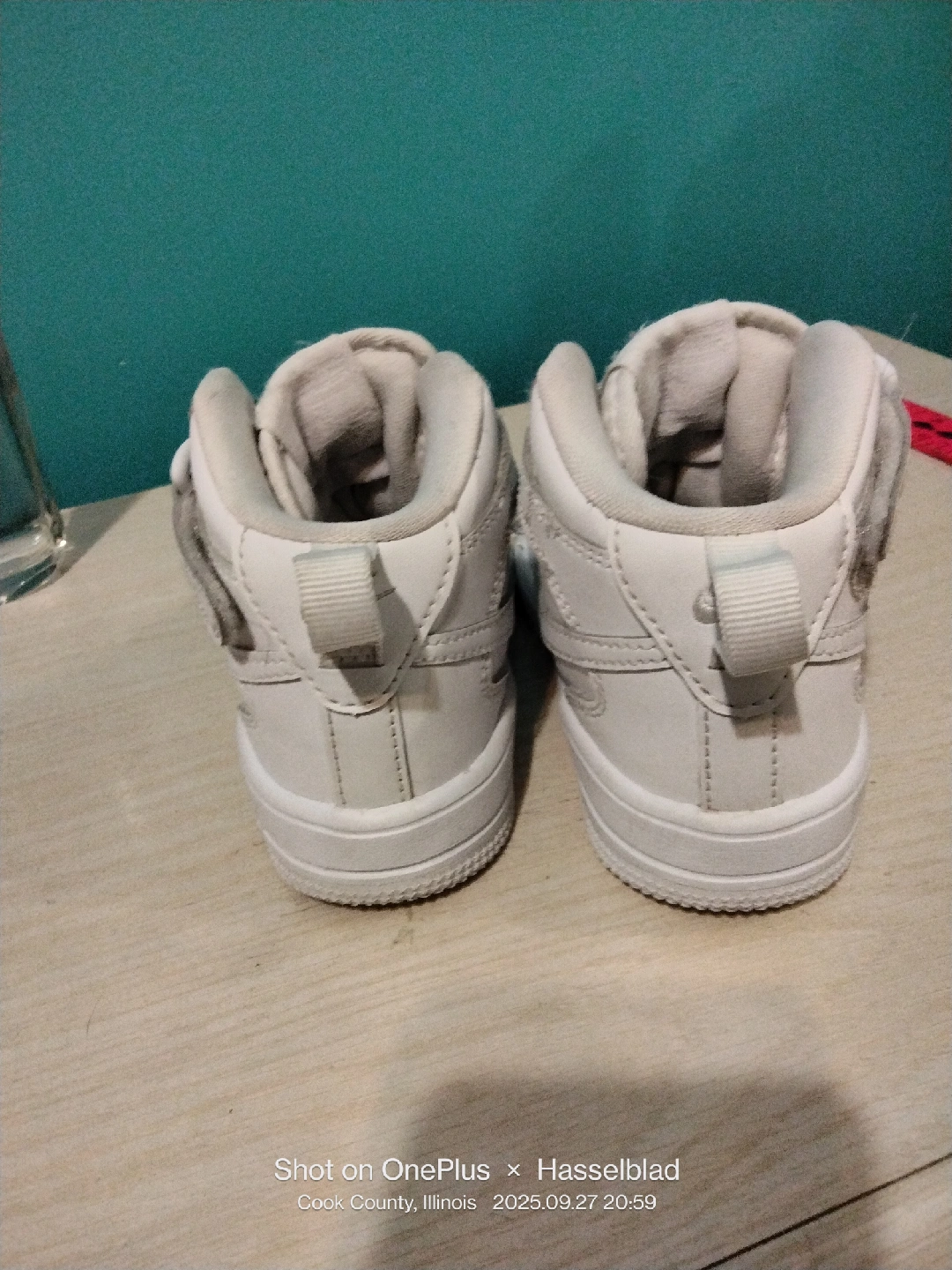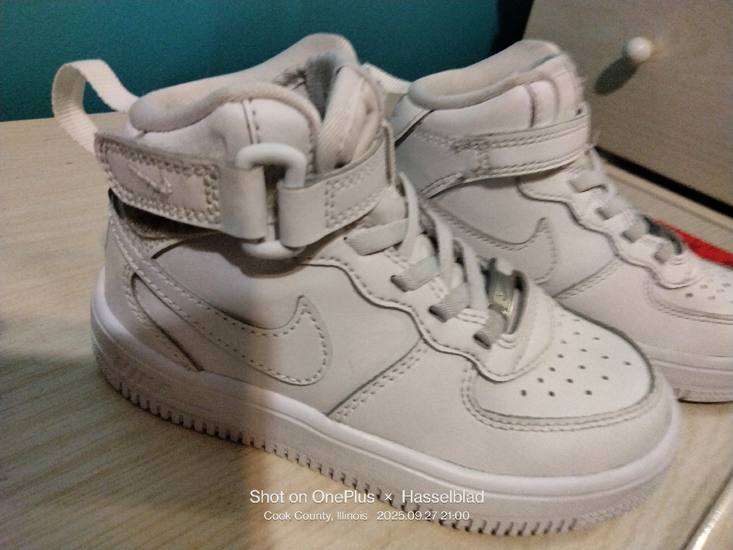 Toddler Nike Air Force 1 high-top sneakers. They are white and have some signs of wear, as pictured. Still in good condition . Size 10 C.