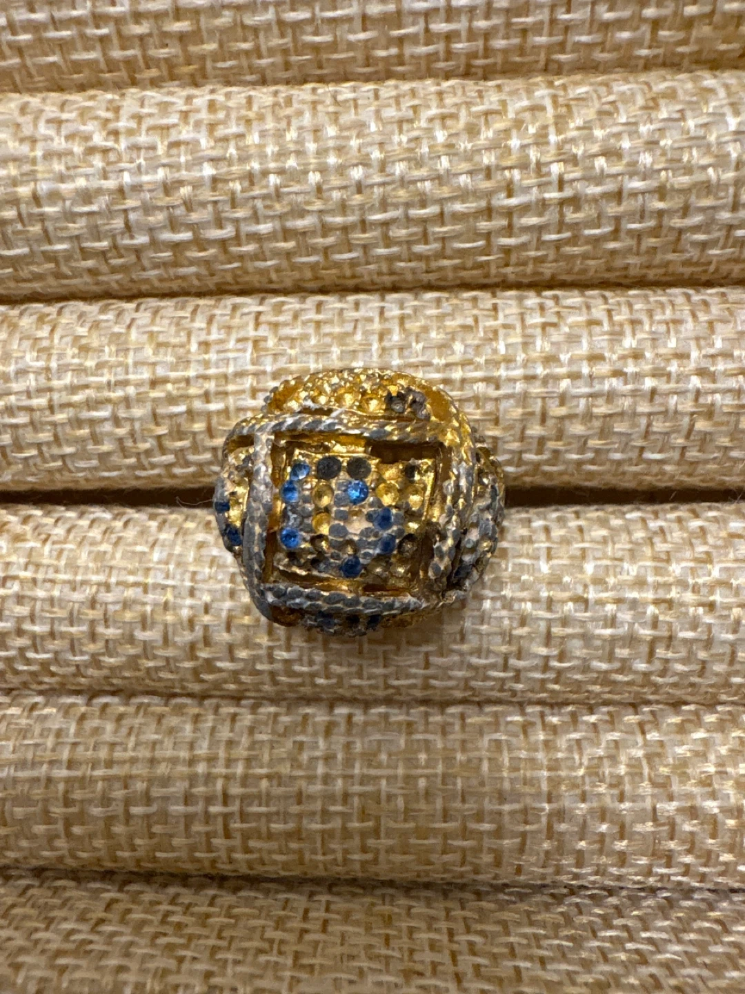 Selling a gold-colored ring with blue accents. It has a unique design and would make a great addition to any jewelry collection! The ring is in good condition.