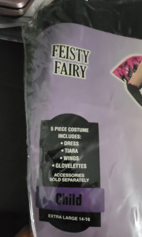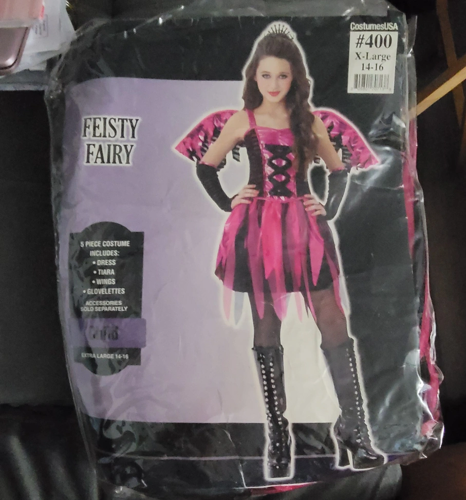 Selling a Feisty Fairy costume for a child. It's an extra large, size 14-16. The 5-piece costume includes a dress, tiara, wings, and gloves. Pickup in River Grove
