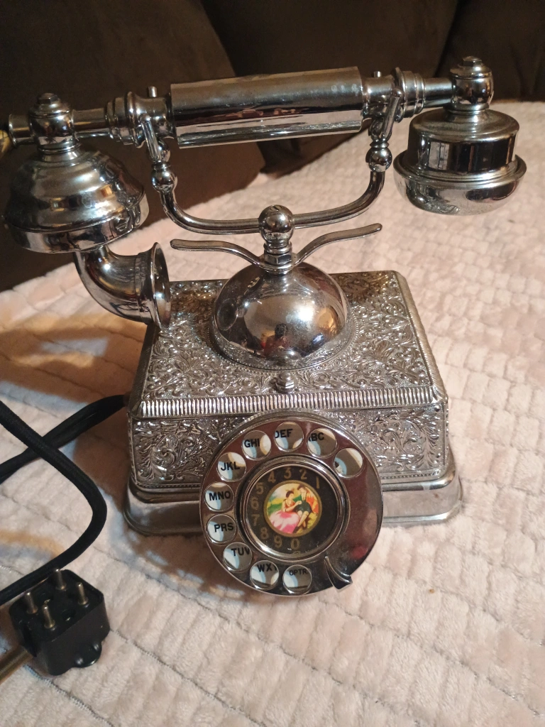 Selling a vintage French Continental silver rotary dial telephone. It's a unique piece with intricate detailing and a classic design. Perfect as a decorative item or for collectors!