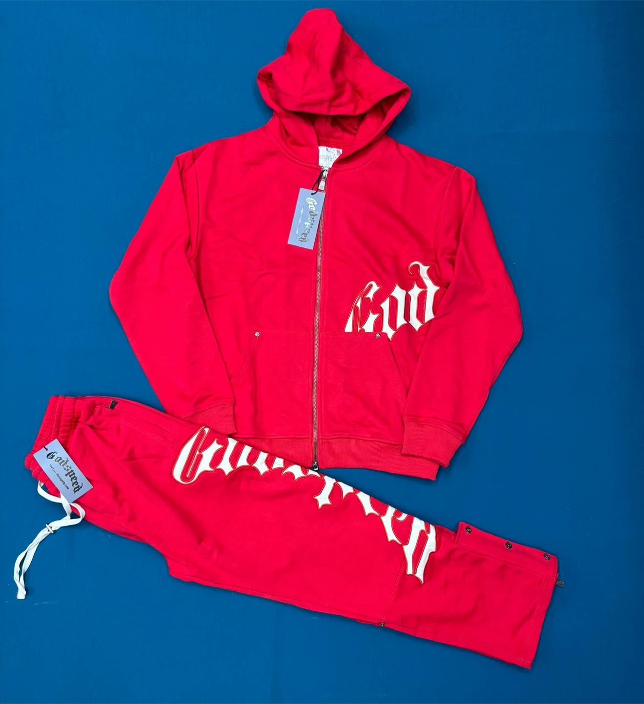 65Selling a Real Recognize Real tracksuit set. The set includes a zip-up hoodie and matching pants. The tracksuit features the brand's logo on both pieces. The color is black with red accents. Perfect for casual wear or lounging around!