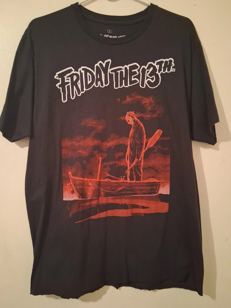 Selling a Friday the 13th graphic t-shirt in size large. The shirt features a cool design with Jason Voorhees. It's made of 100% cotton. open for trades.