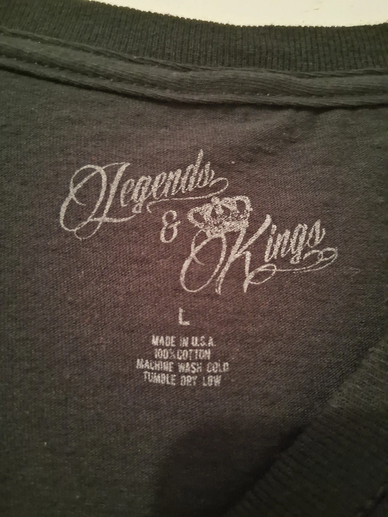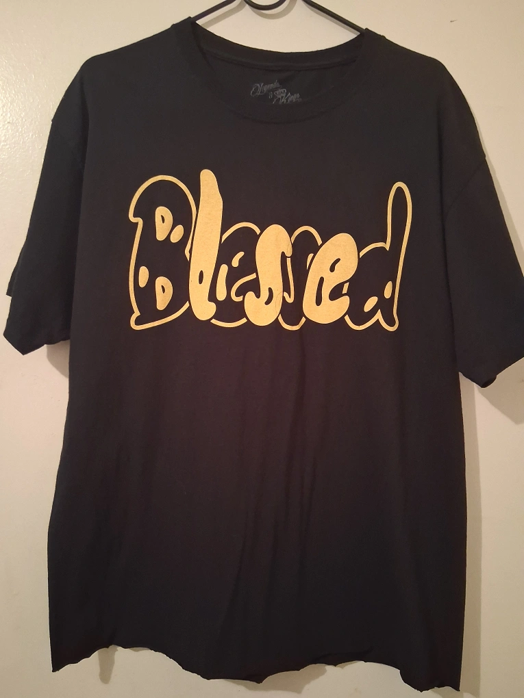 Selling a Legends & Kings black t-shirt with 'Blessed' in gold lettering. It's size L and made of 100% cotton.