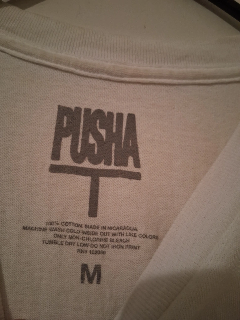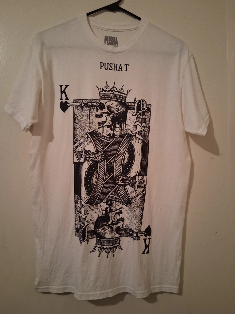 Selling a PUSHA T graphic t-shirt in size medium! It's white with a cool graphic print on the front. Made of 100% cotton. open for trades.