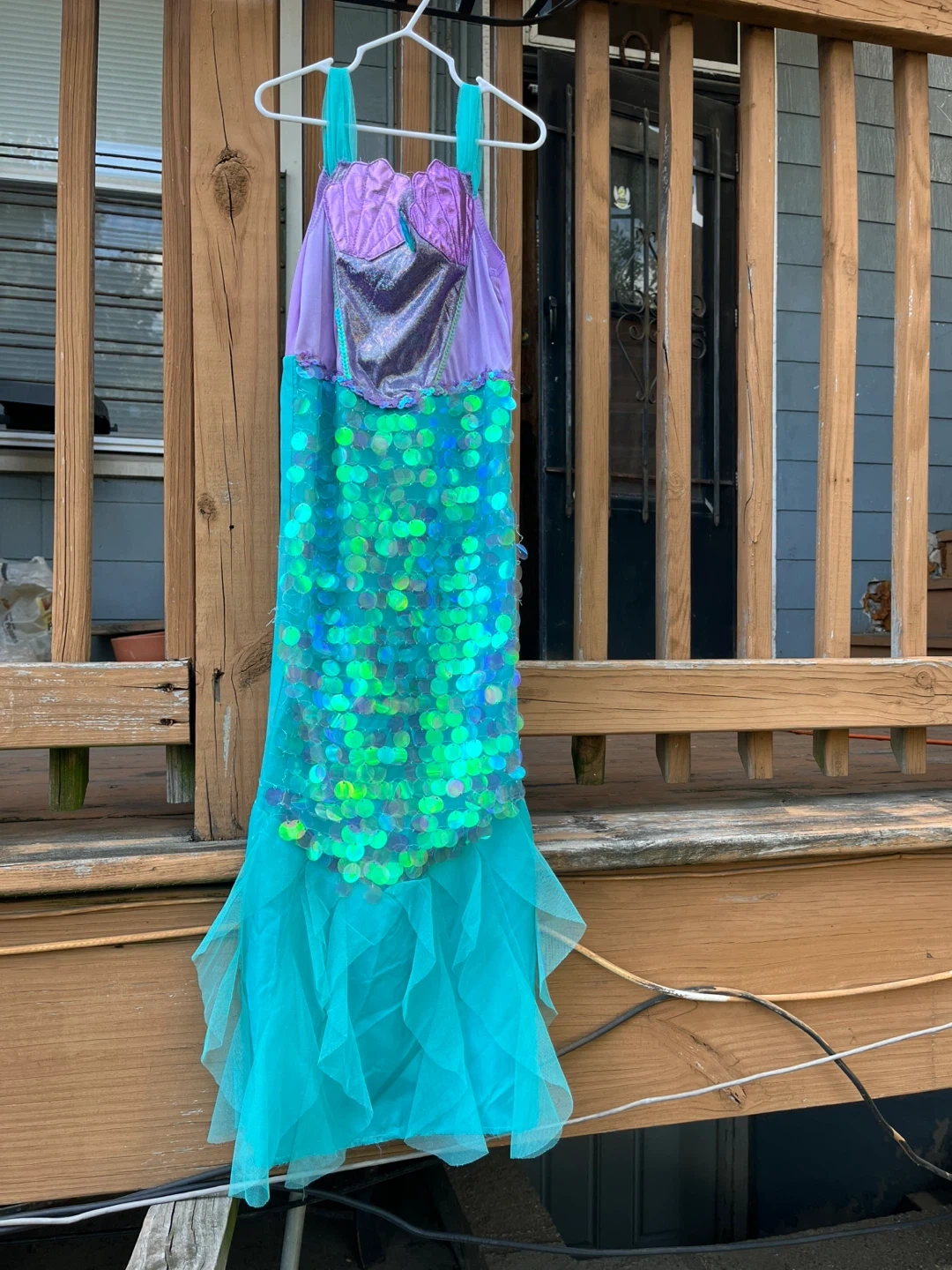 Cute mermaid costume for dress-up or play! It features a purple top and a sparkly blue and green sequined tail. Perfect for your little one's imagination and fun!