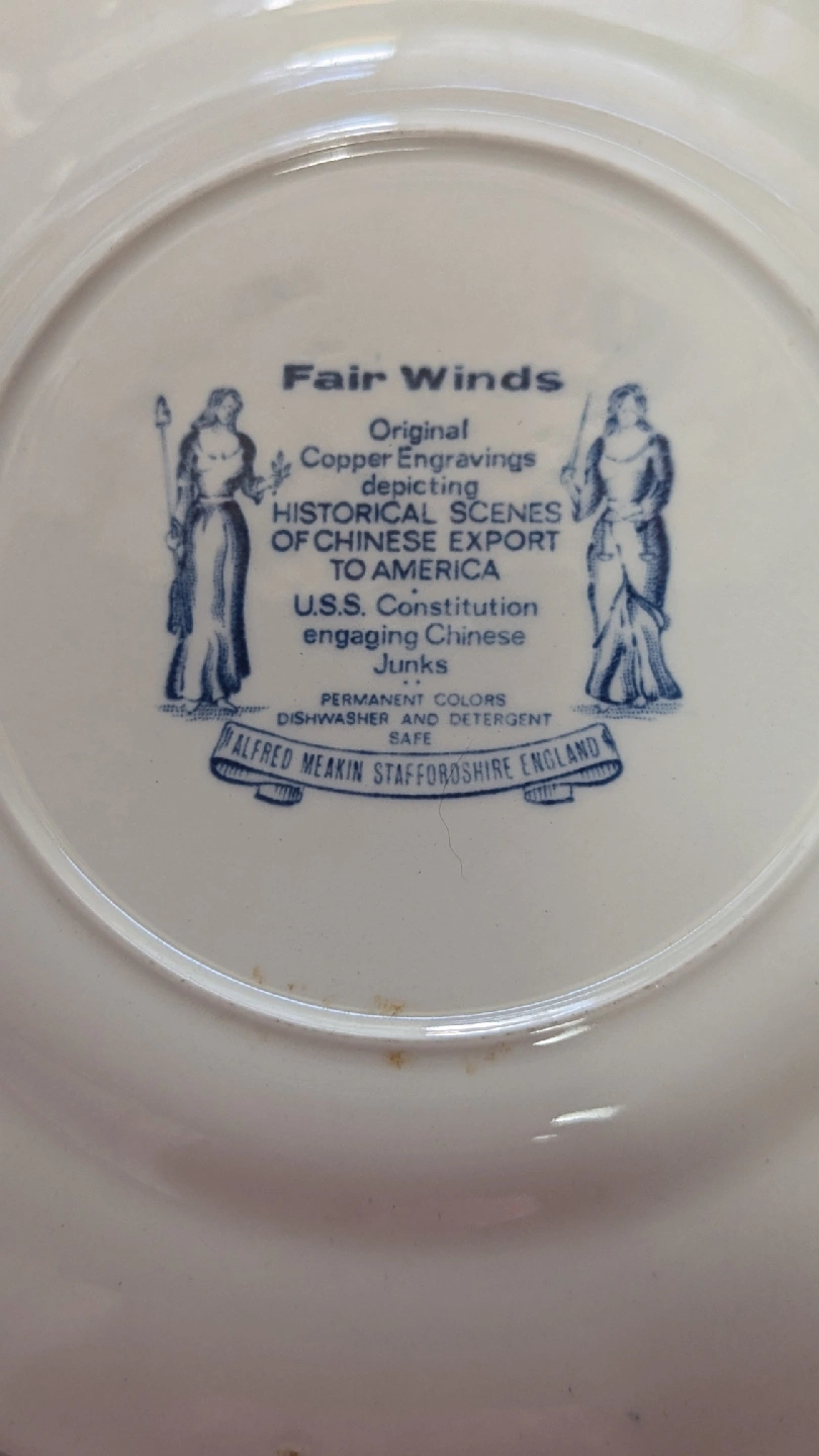 Selling two Fair Winds plates by Alfred Meakin Staffordshire England. They feature original copper engravings depicting historical scenes of Chinese export to America. The scenes show the U.S.S. Constitution engaging Chinese junks. The plates are dishwasher and detergent safe set of 2 plates