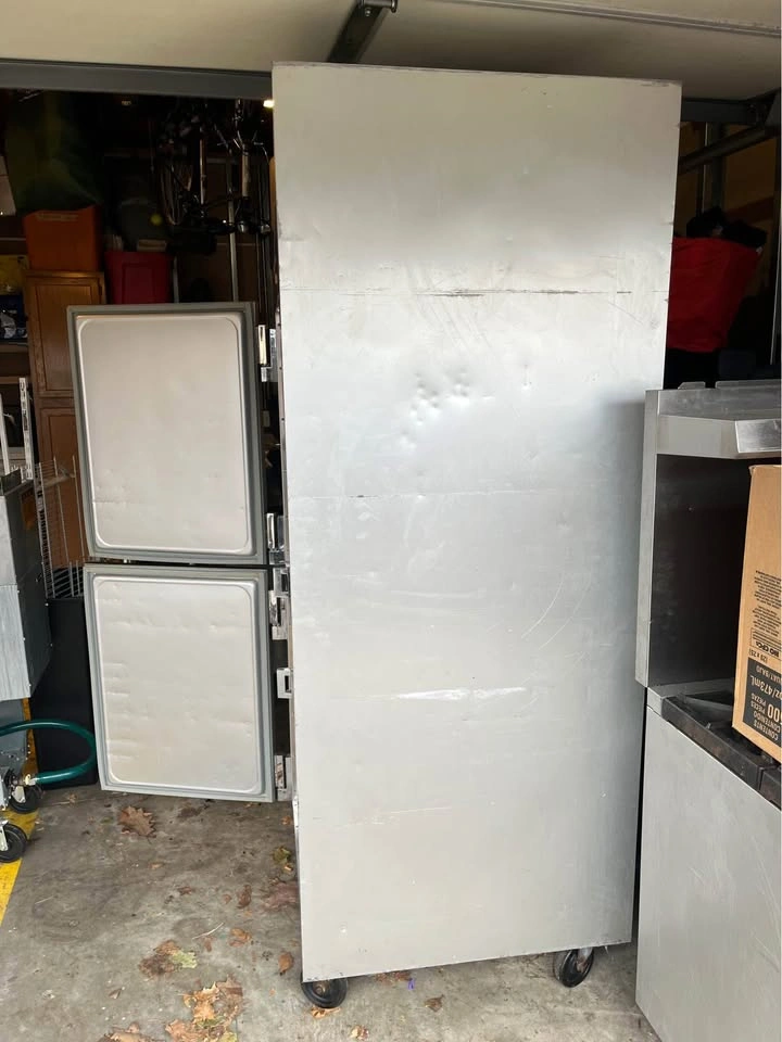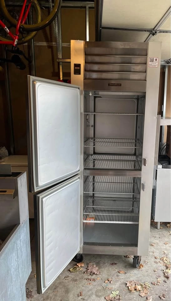 A few bumps and dents on the side. Designer Line Freezer, reach-in, one-section, self-contained refrigeration, stainless steel exterior & interior, shallow depth cabinet, half-height solid doors, cylinder locks, electronic control with digital display, hi-low alarm, 6" stainless steel legs, R290 hydrocarbon retrigerant, 1/2 HP, cETLus, NSF. Runs great!