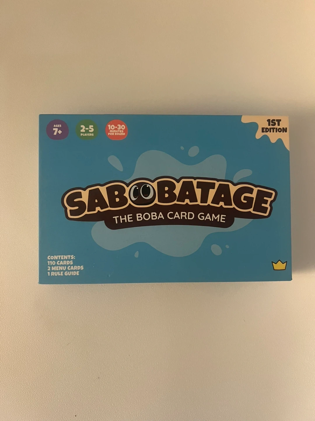 72Selling a brand new Sabobatage: The Boba Card Game, 1st Edition! It's designed for ages 7+, 2-5 players. The box includes 150 cards, 2 menu cards, and a rule guide. Super fun game for kids.