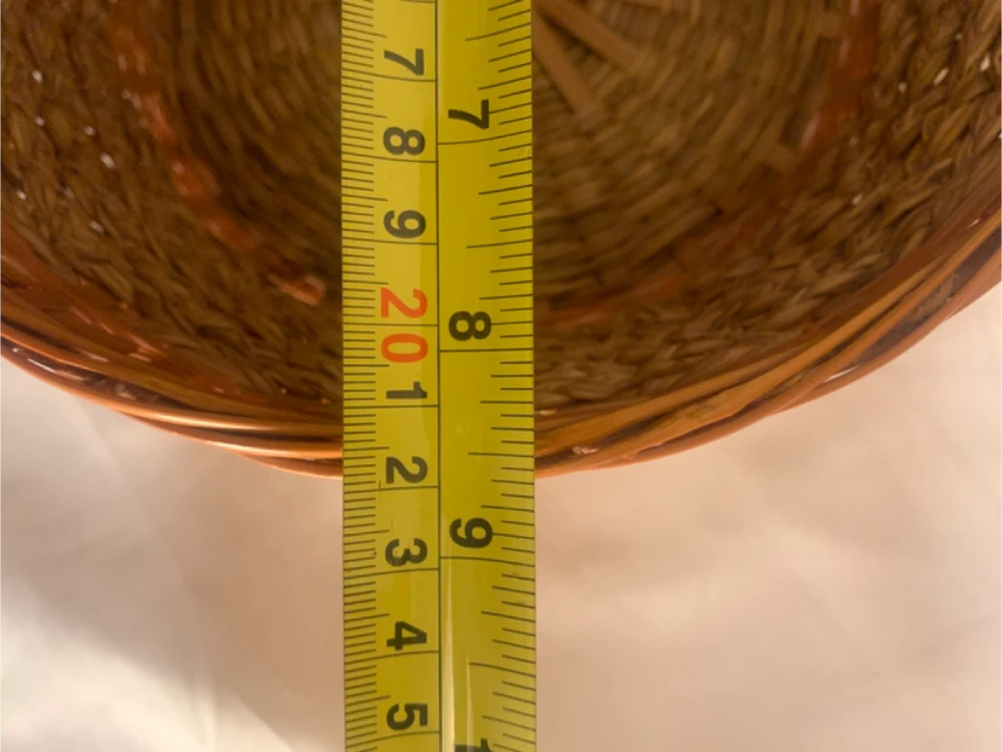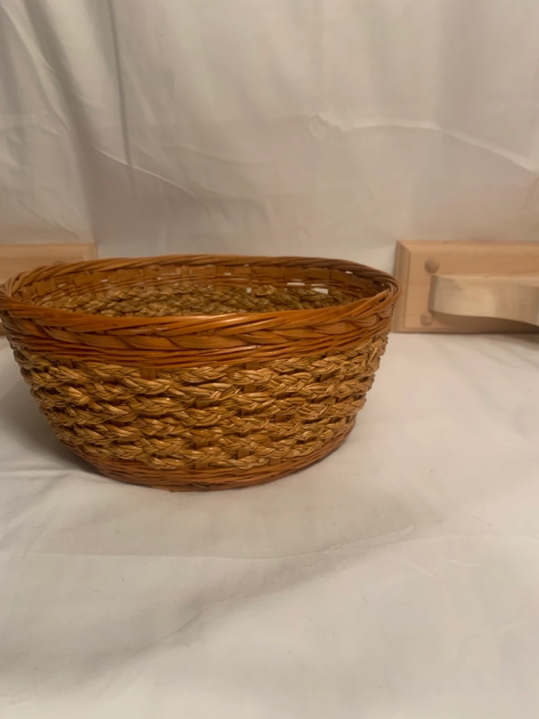 Medium-sized round wicker basket, perfect for storage, display, or as a fruit/vegetable holder. Features a two-tone woven design with a sturdy rim. Pre-loved and in great condition with no major flaws.