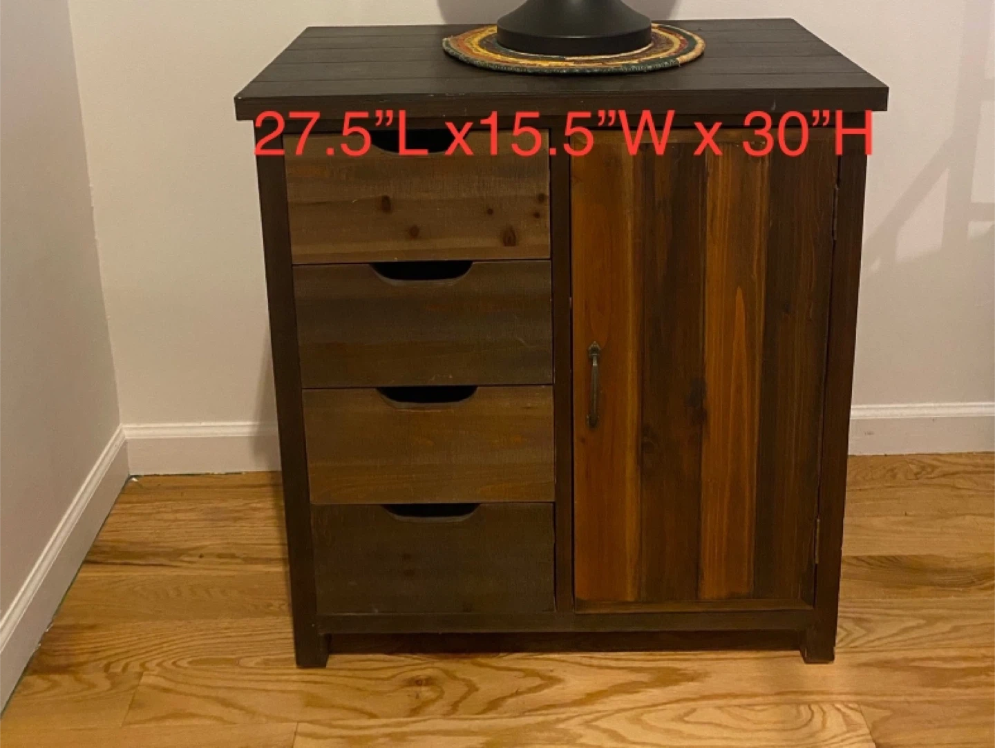 Selling a wooden cabinet featuring three drawers and a cabinet door. The dimensions are approximately 27.5 inches in length, 15.5 inches in width, and 30 inches in height