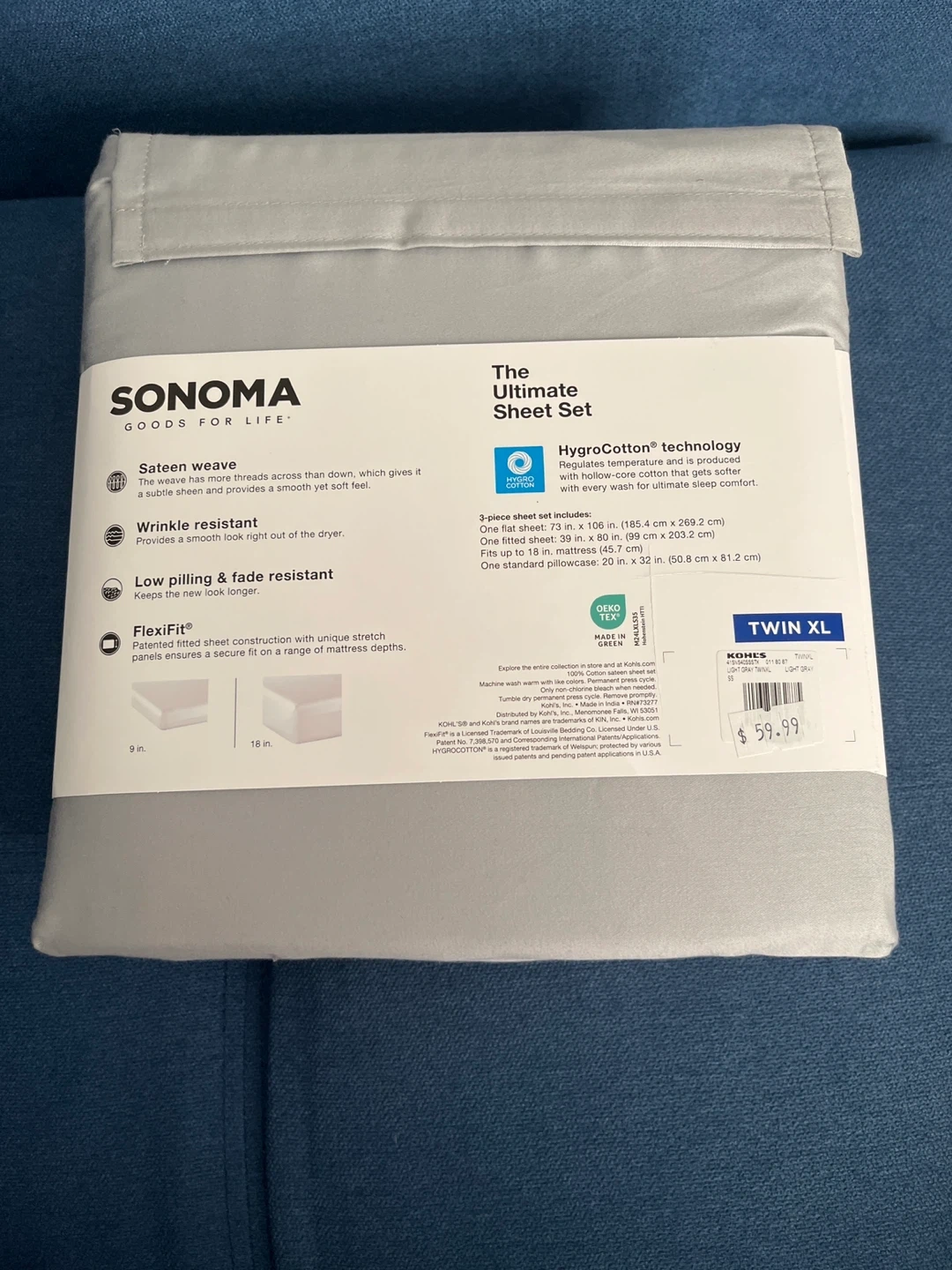 (LIGHT GRAY) New Sonoma Goods For Life Twin XL sheet set. It's dorm ready and features HydroCotton technology. - 400 thread count - 100% cotton - Temperature regulating - Sateen weave - Wrinkle resistant - Low pilling and fade resistant Originally bought for $59.99!