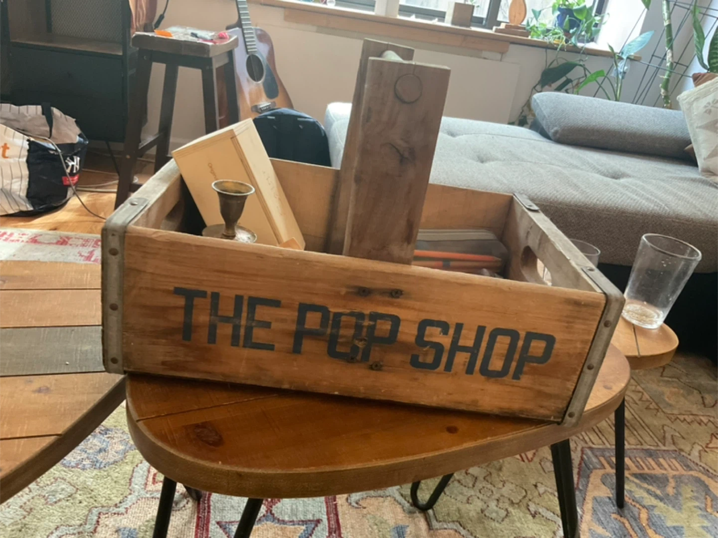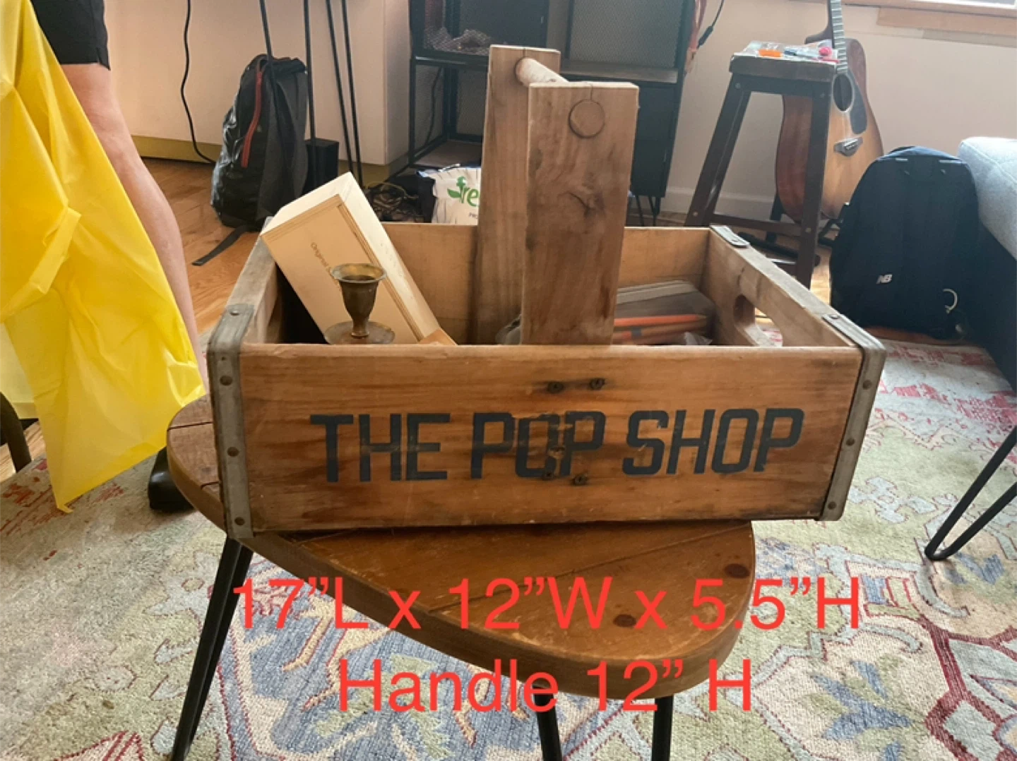 Selling a wooden box from The Pop Shop! It's in great shape and ready for a new home. The dimensions are approximately 17" L x 12" W x 5.5" H, with a handle height of 12".