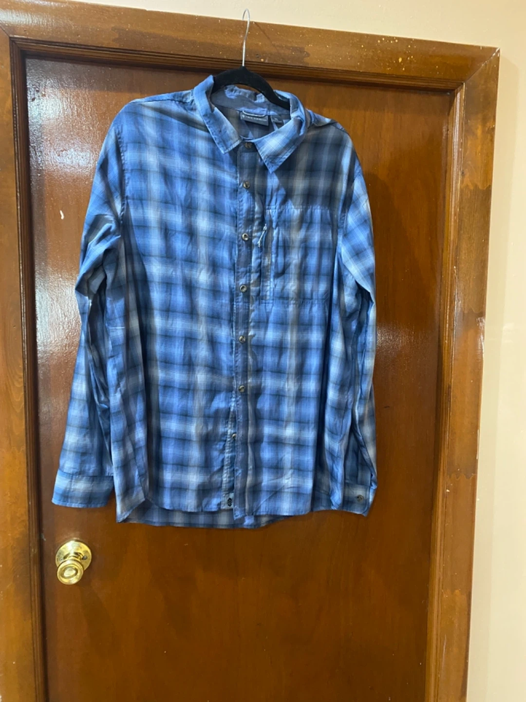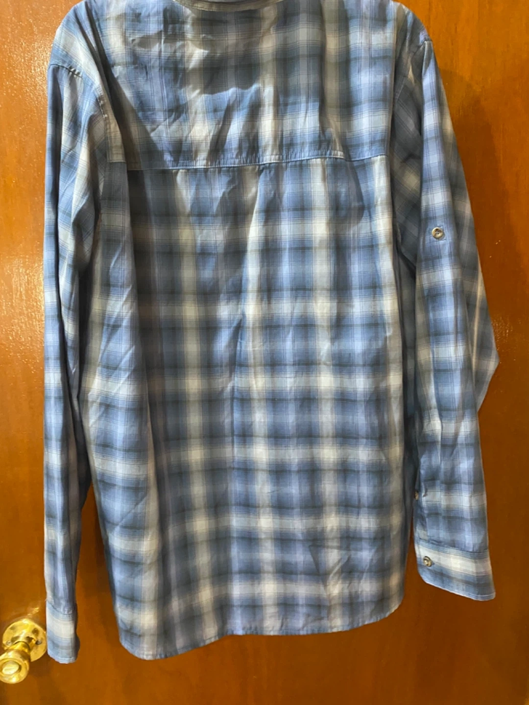 Here's a Free Country button-down shirt in size XL! It features a classic blue plaid pattern and is perfect for casual wear. The material is lightweight and comfortable. It's in great condition and ready for a new home