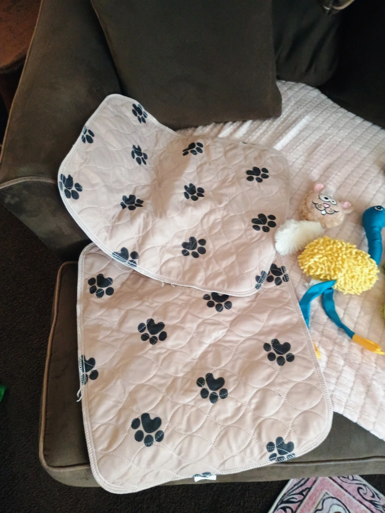 A collection of fun dog toys in various shapes and colors! Also included are two paw print pads for your furry friend