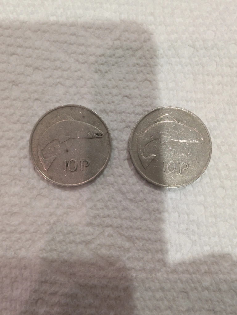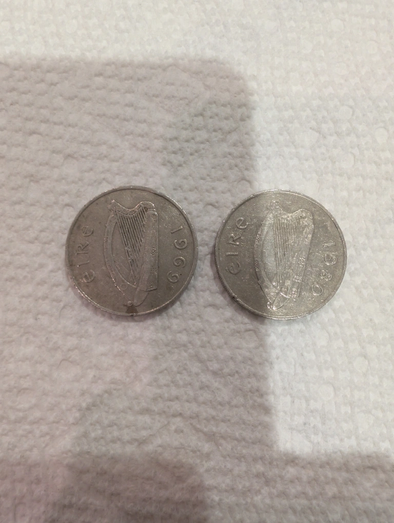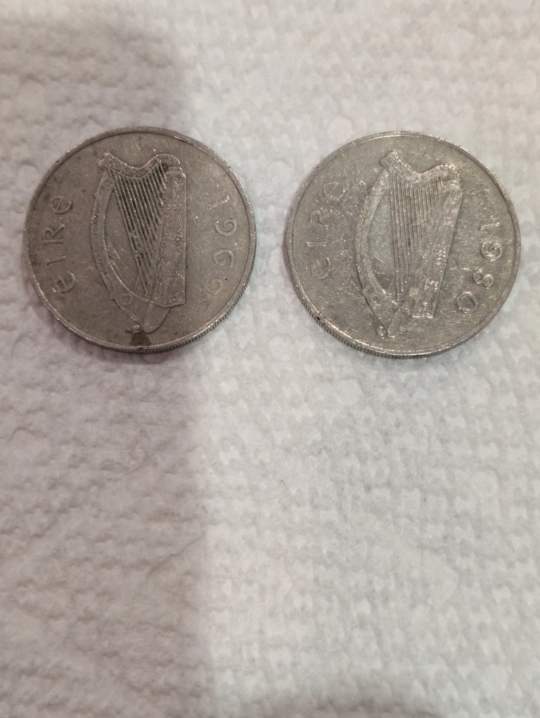 Vintage Irish two coin 1969 and 1980 featuring obverse Irish Harp with the date, reverse the vawe below an Atlantic salmon . Composition 75% cooper and 25% nickel