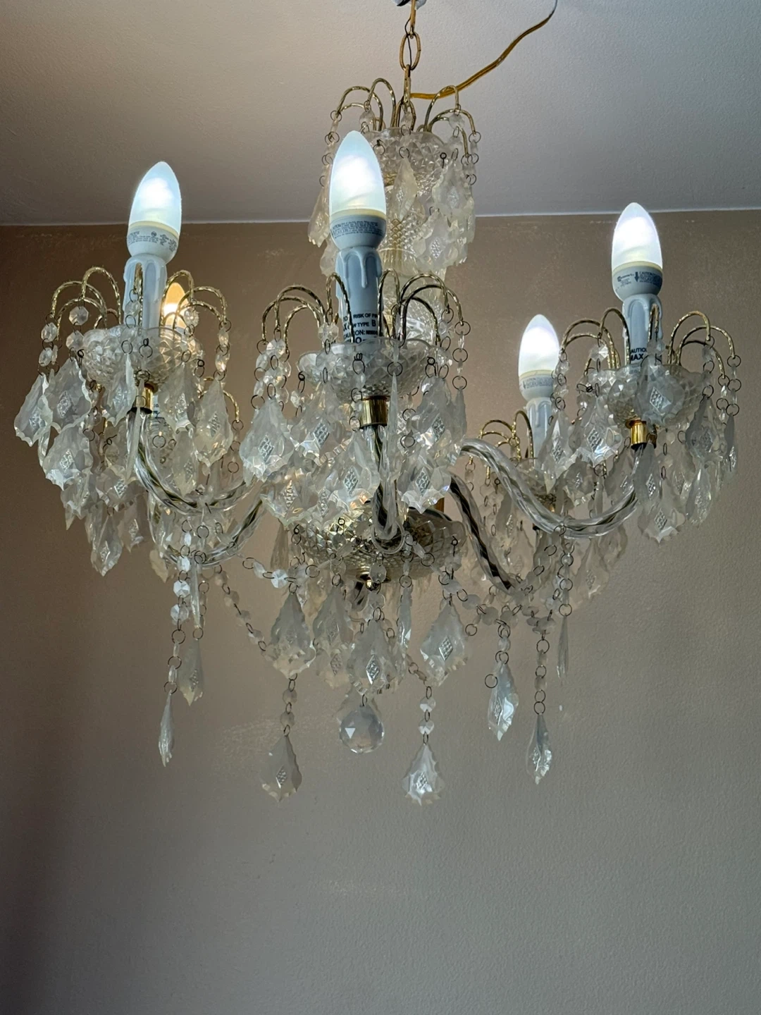 Selling a beautiful chandelier! It has a classic design with sparkling crystals that catch the light. Perfect for adding a touch of elegance to any room