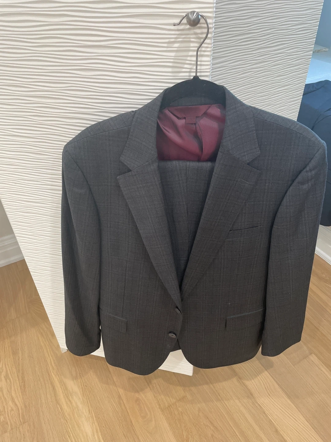 Selling a Trend Maxman Fresco suit in size 44/38R. The suit is charcoal plaid and made of 100% wool super 140's. The lining is 50% polyester and 50% viscose. It’s in great condition and ready for a new home