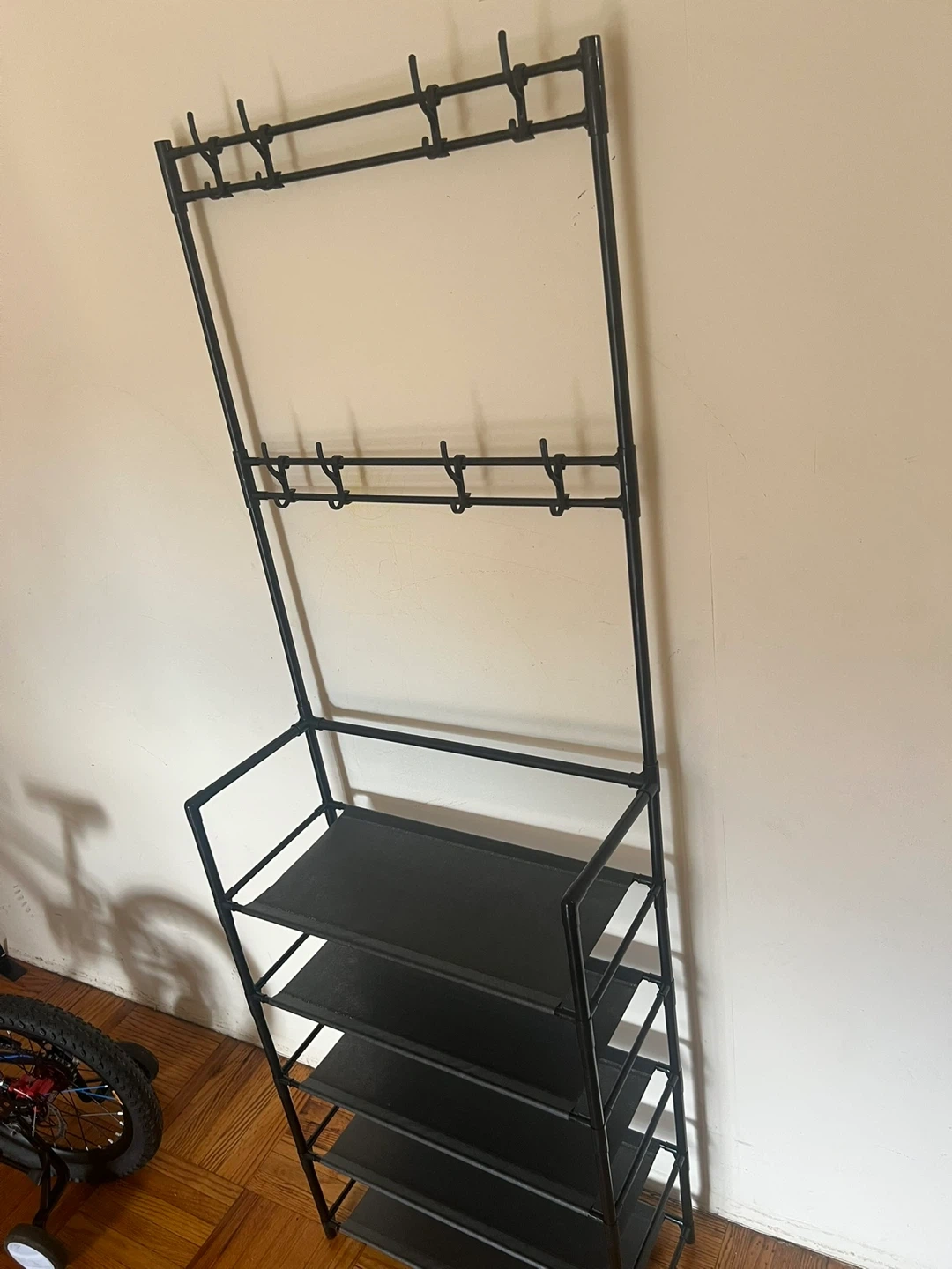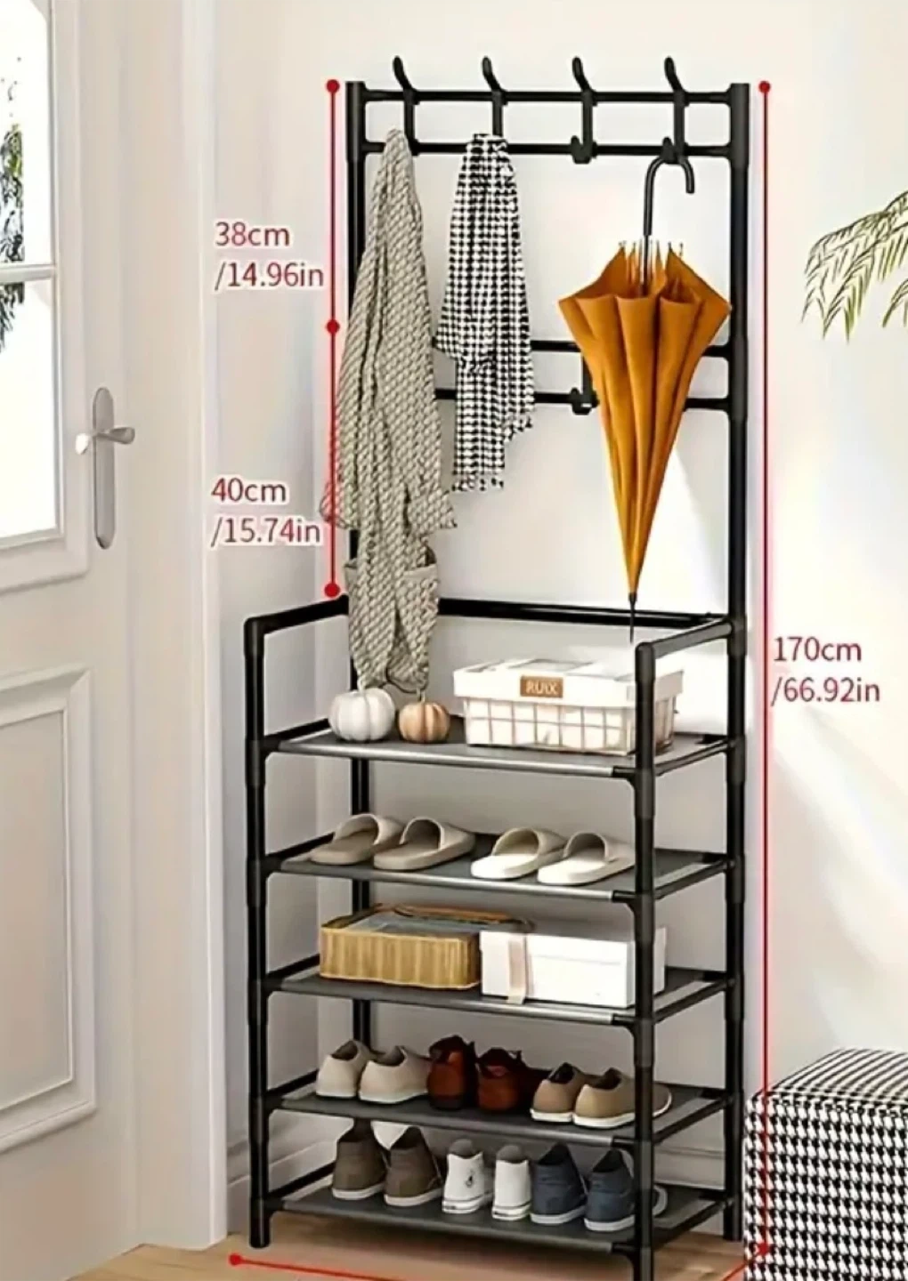 This black coat rack and shoe organizer is perfect for keeping your entryway tidy! It features multiple shelves for shoes and hooks for coats and hats. The dimensions are approximately 66.92 inches (170cm) tall, with the coat rack section being about 14.96 inches (38cm) and the shelf section about 15.74 inches (40cm).