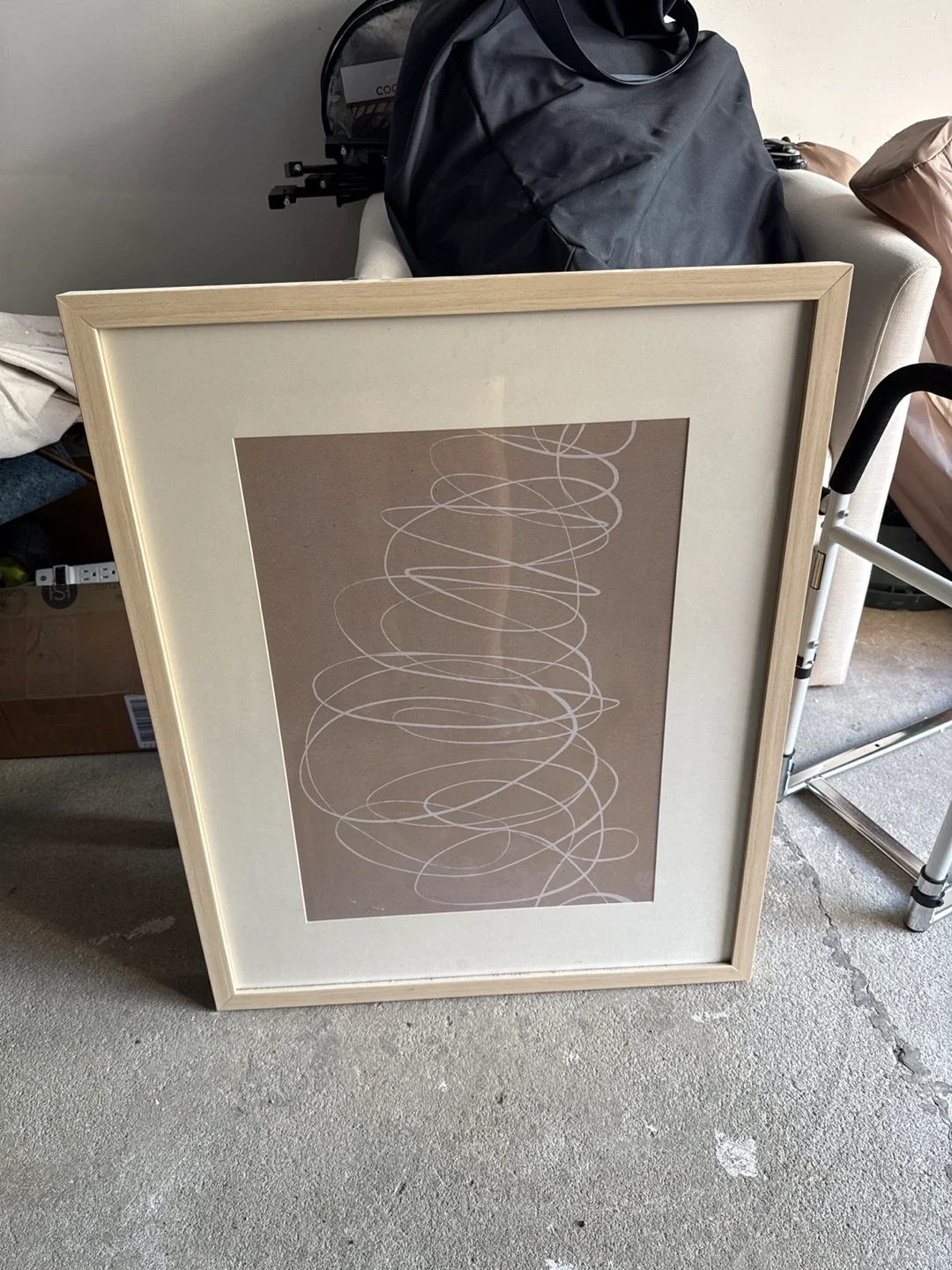 Selling a framed piece of abstract art. The frame is a light natural wood color, and the artwork features a brown background with white line art. It's in good condition and ready to add a touch of modern style to your space