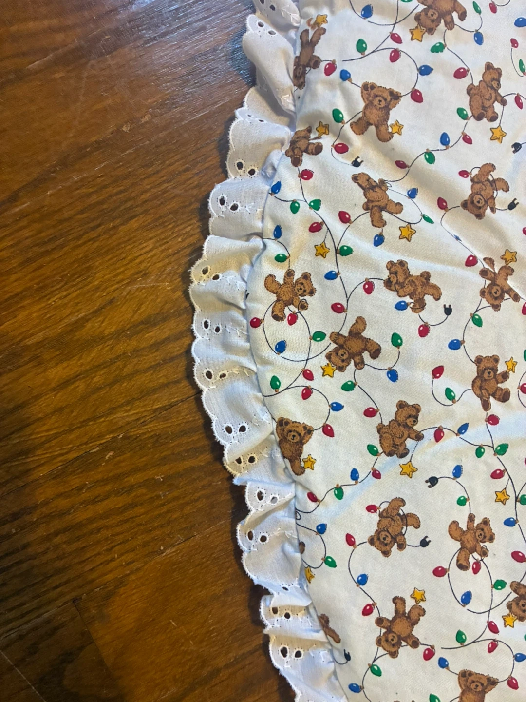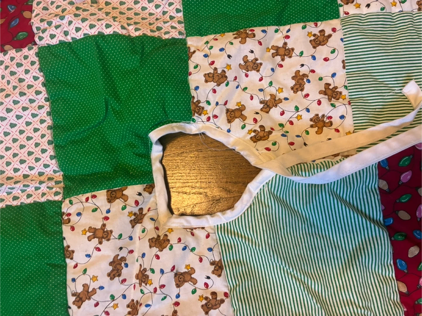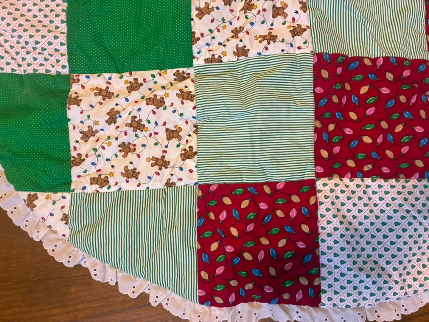 75Here's a charming quilted Christmas tree skirt! It features a patchwork design with various festive patterns, including teddy bears, Christmas lights, and striped fabrics. The skirt is finished with a delicate white lace trim. Perfect for adding a cozy and handmade touch to your holiday decor