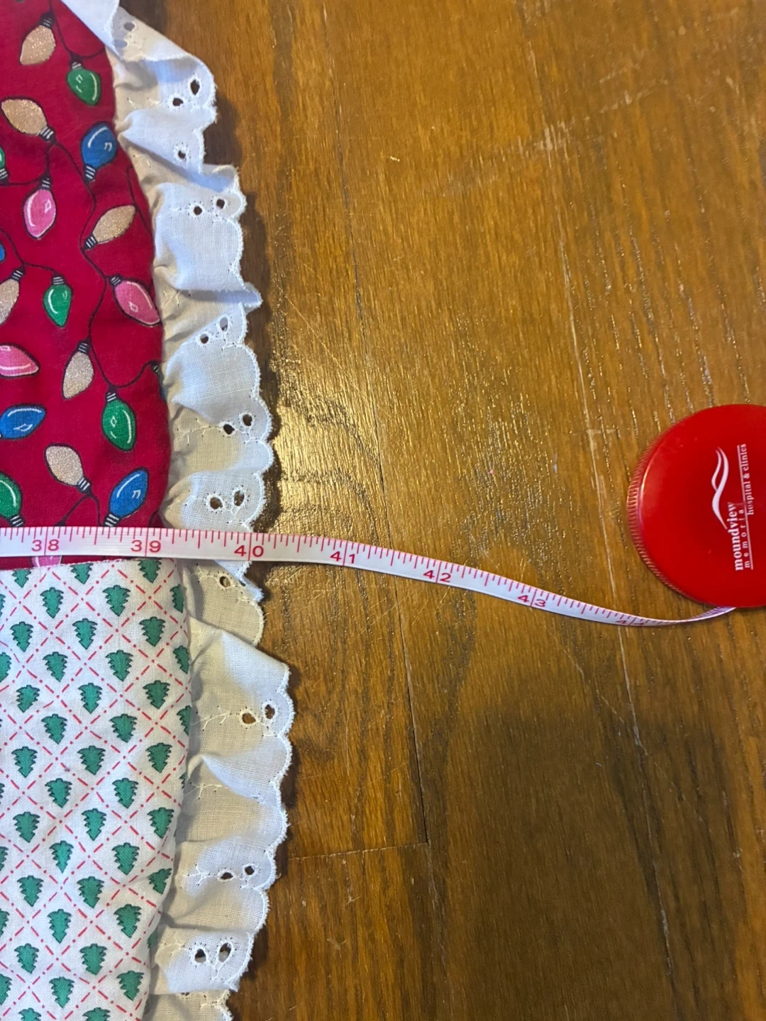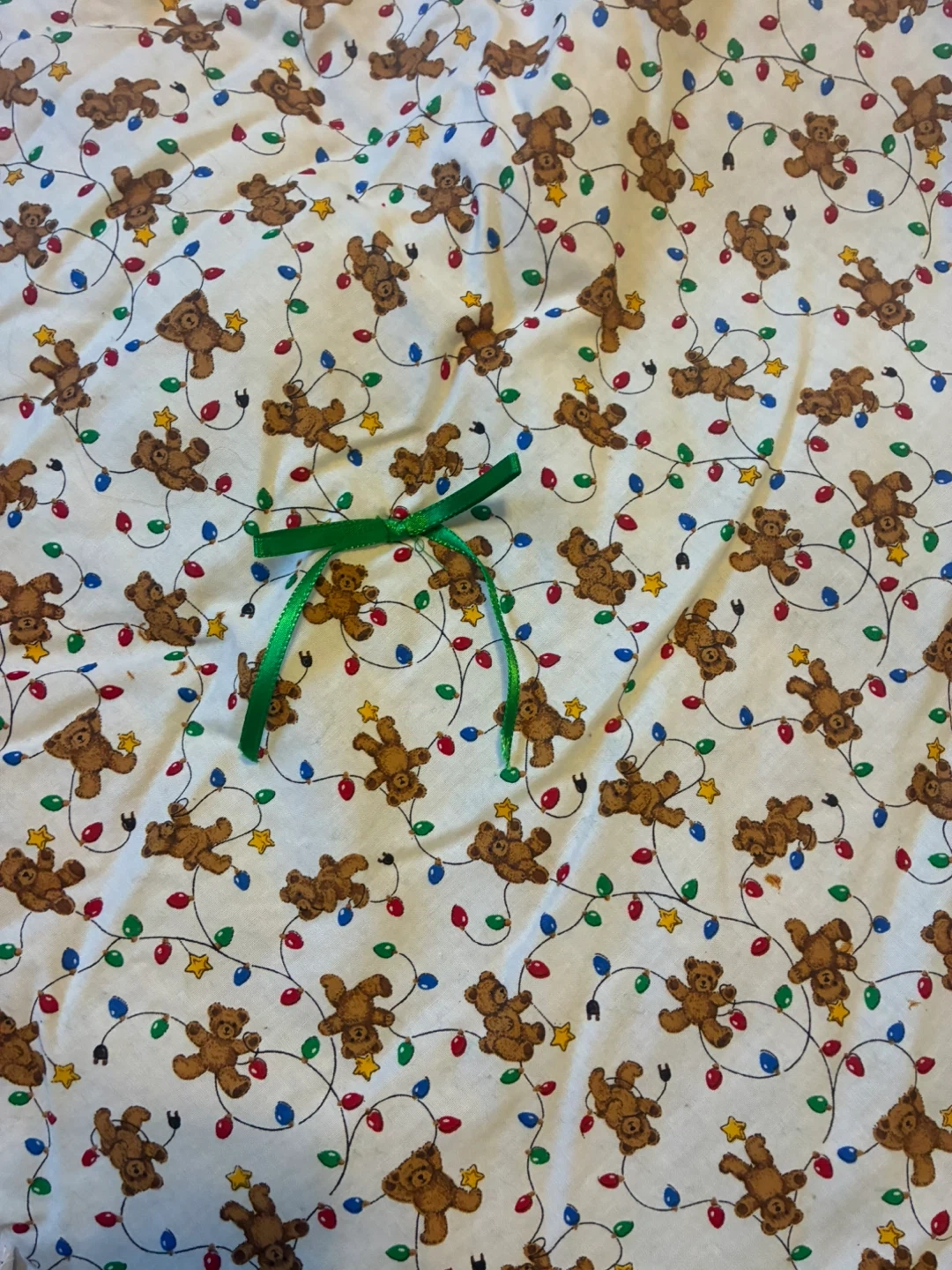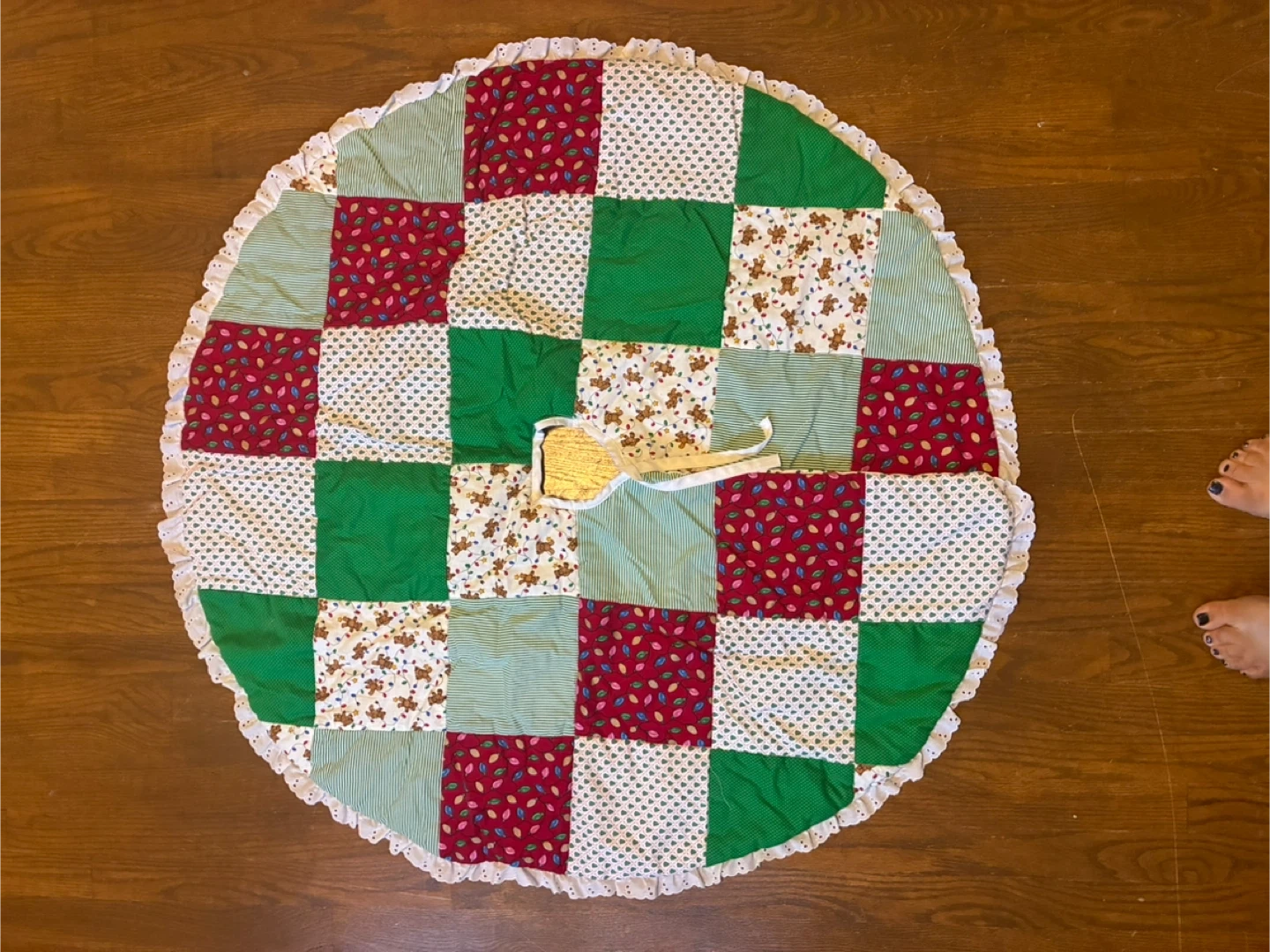 75Here's a charming quilted Christmas tree skirt! It features a patchwork design with various festive patterns, including teddy bears, Christmas lights, and striped fabrics. The skirt is finished with a delicate white lace trim. Perfect for adding a cozy and handmade touch to your holiday decor