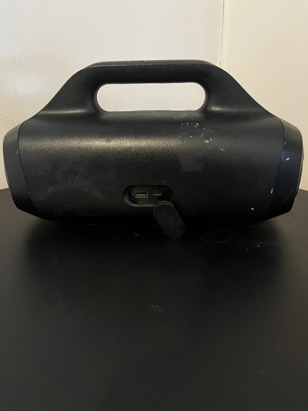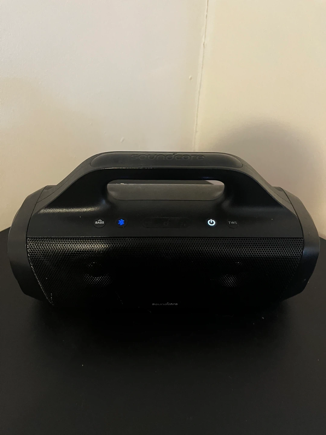 Selling a Soundcore speaker in black. It has a handle for easy carrying and buttons for bass, power, and TWS. It has some cosmetic wear.(One charge last over 24 hrs plus you can also charge other devices while in use)
