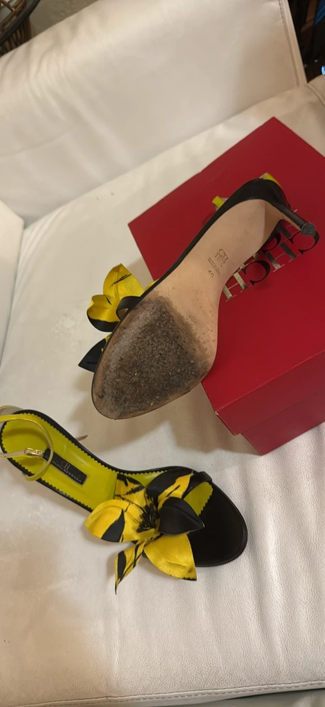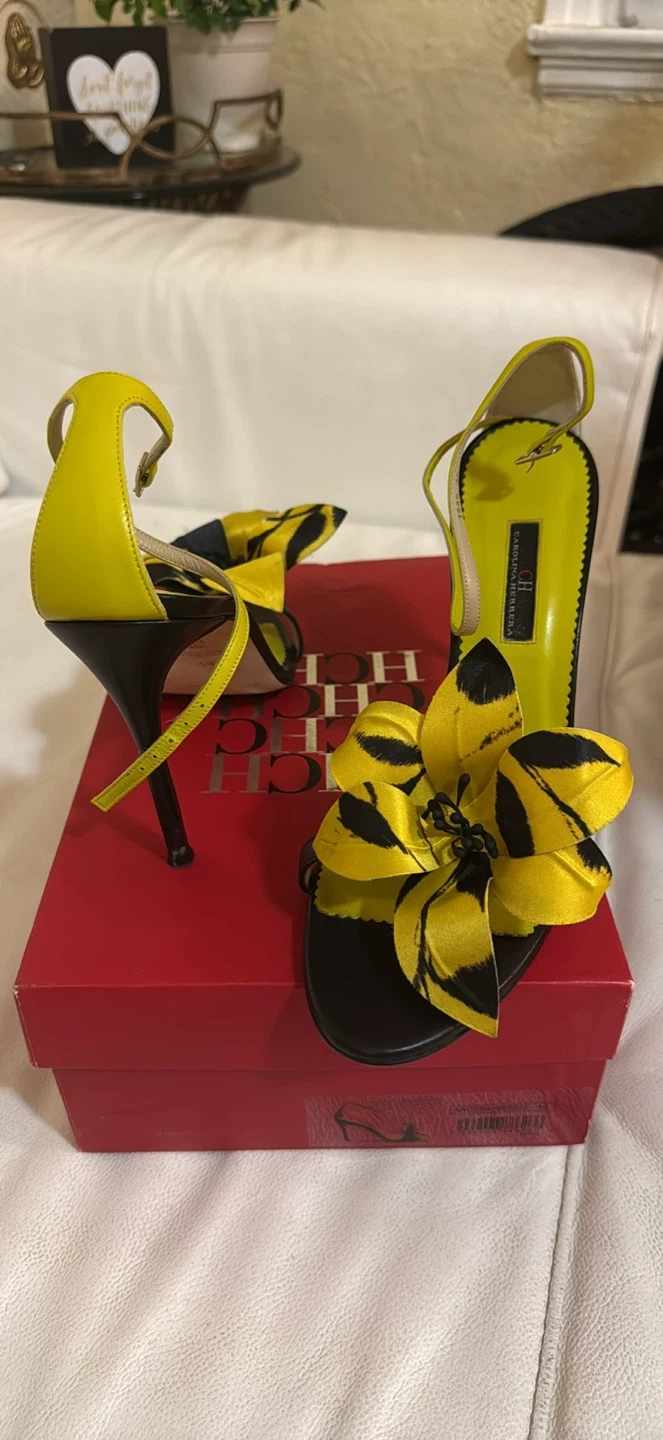 These Carolina Herrera heels are so unique! They feature a vibrant yellow and black floral design and a sleek black heel. They are a size 9 and come with the original box. They show some signs of wear on the soles, but the uppers are in great condition