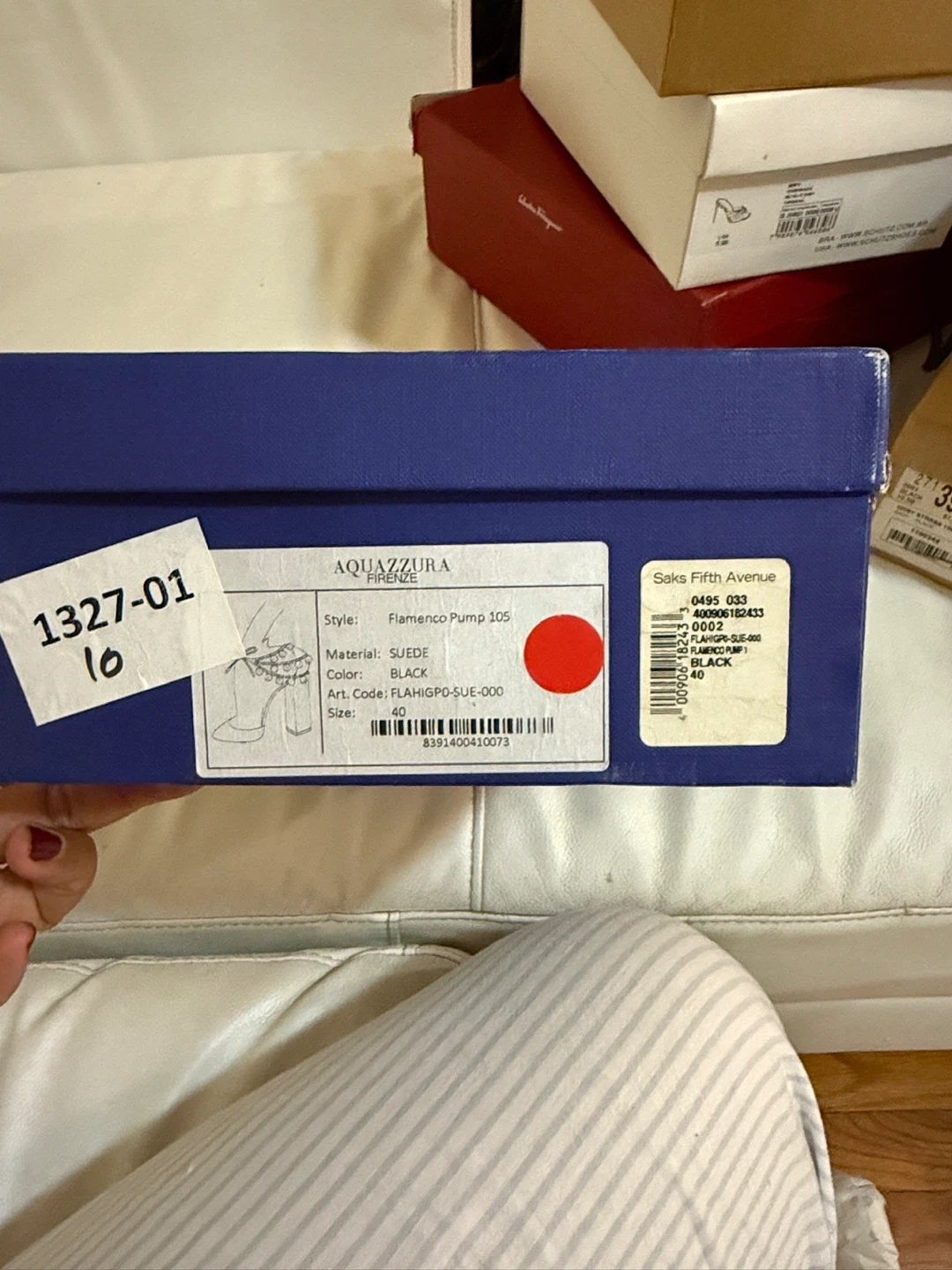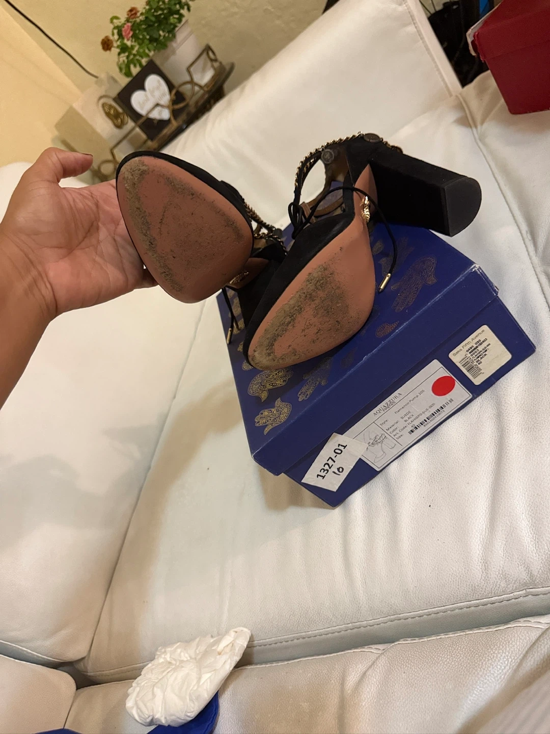 Selling a pair of Aquazzura sandals in size 10. They are black suede with gold chain detailing and come with the original box. These stylish sandals are perfect for adding a touch of elegance to any outfit