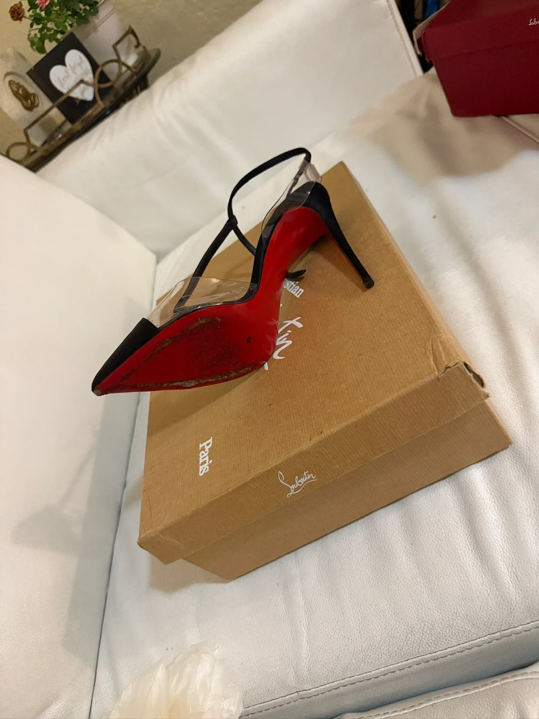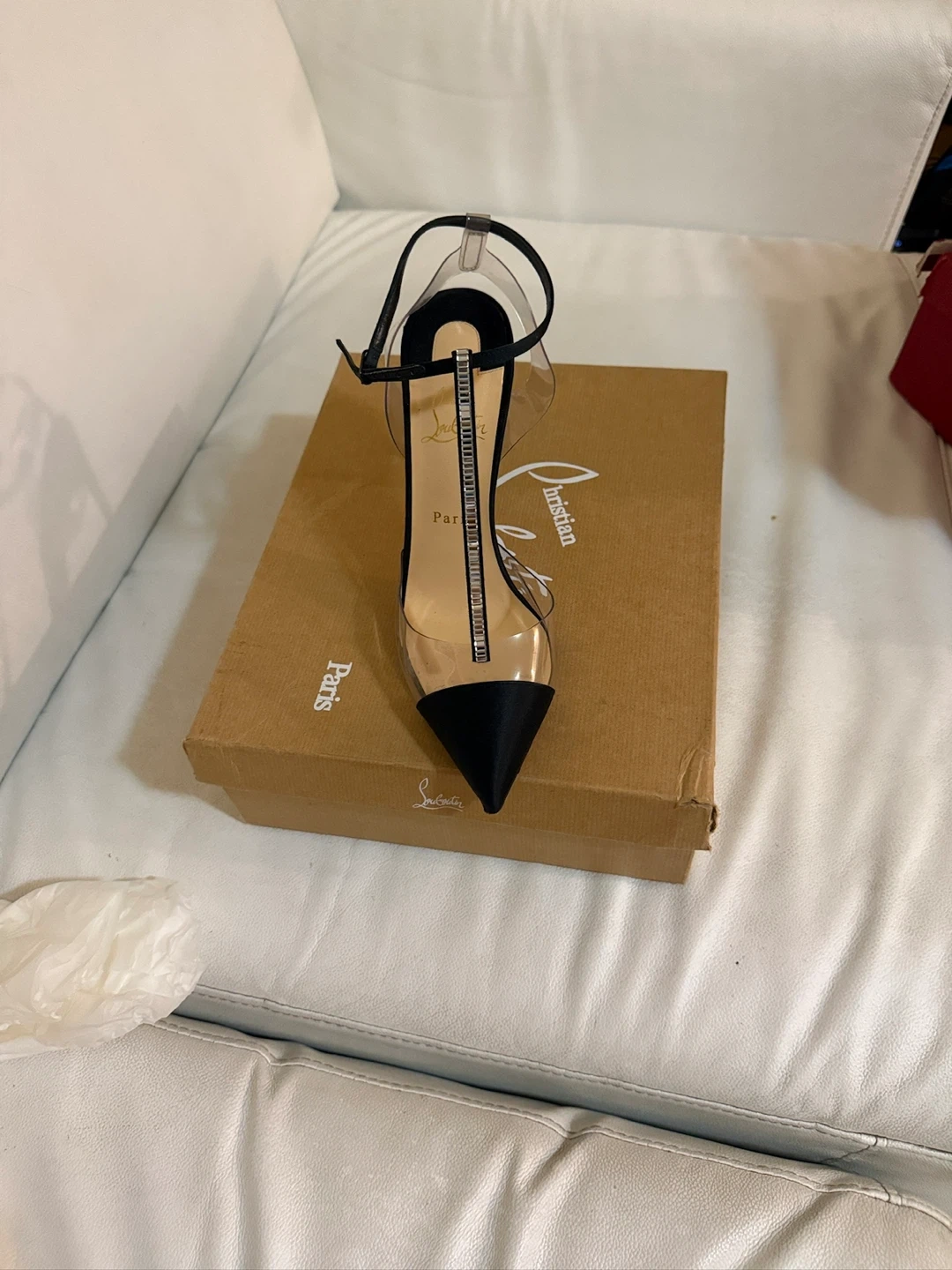 Selling a pair of Christian Louboutin heels. They feature a unique design with a black toe, clear sides, and a red heel. The original box is included!