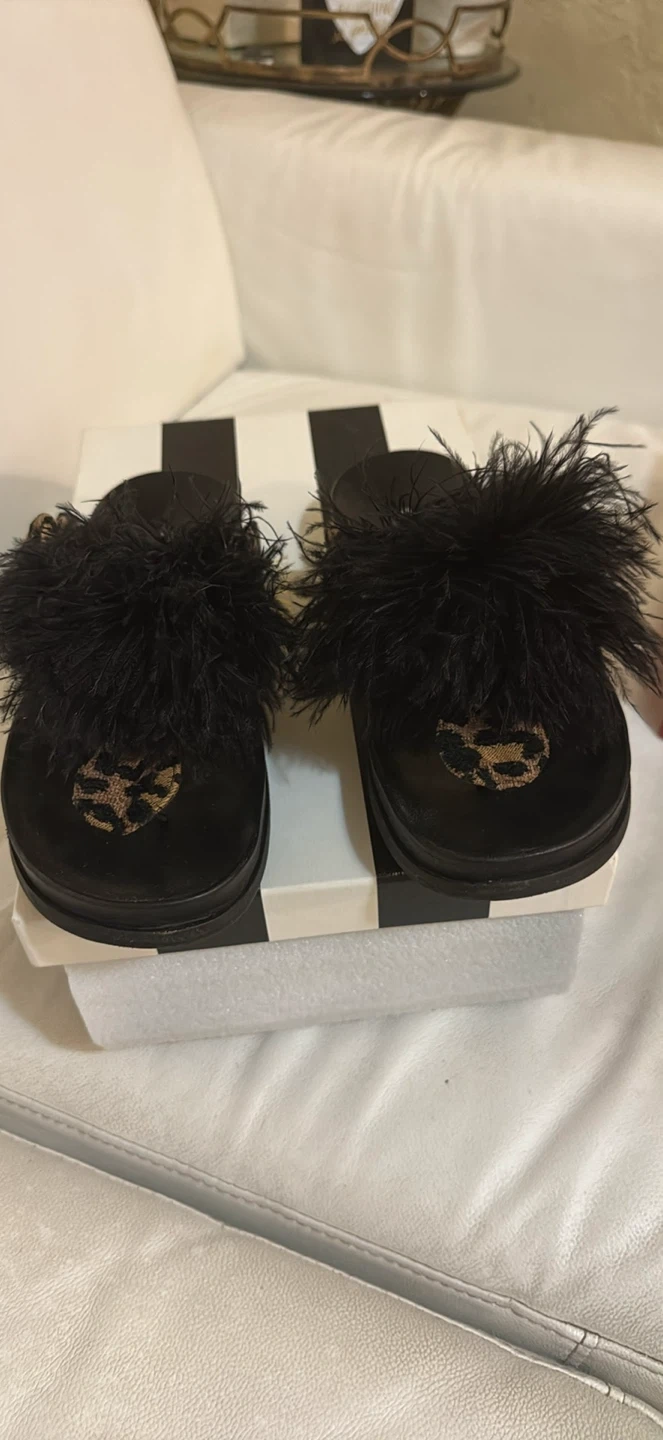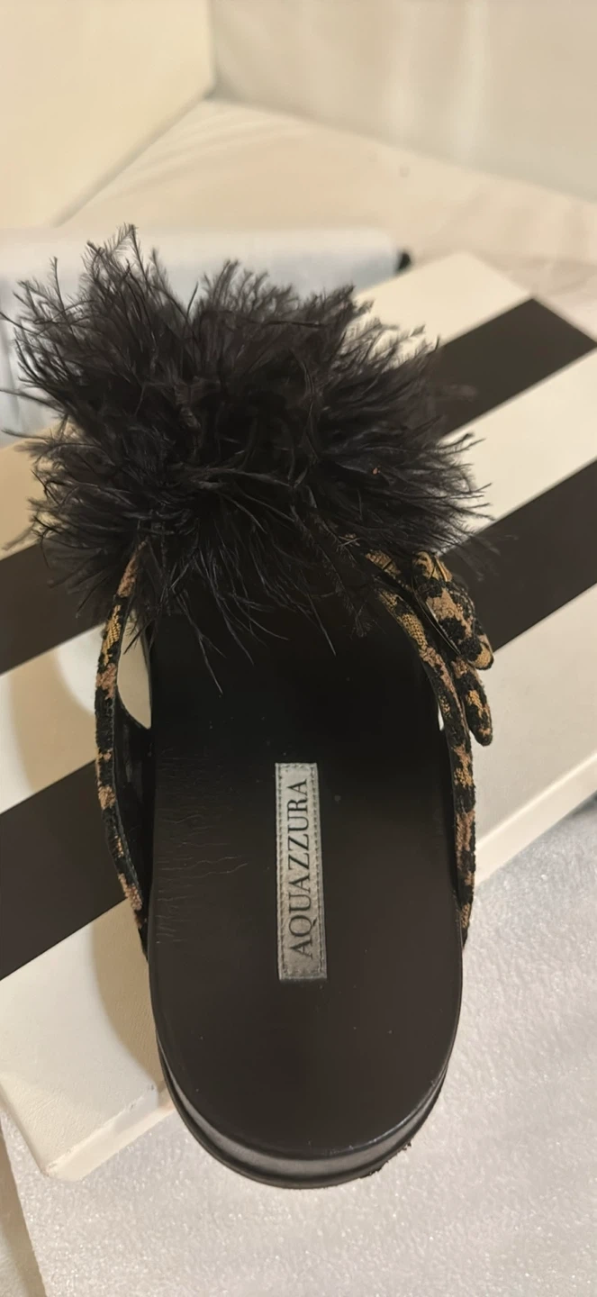 These Aquazzura slides feature a stylish combination of black and leopard print, adorned with fun feathers! They're in great condition and come with the original box. Perfect for adding a touch of flair to your outfit