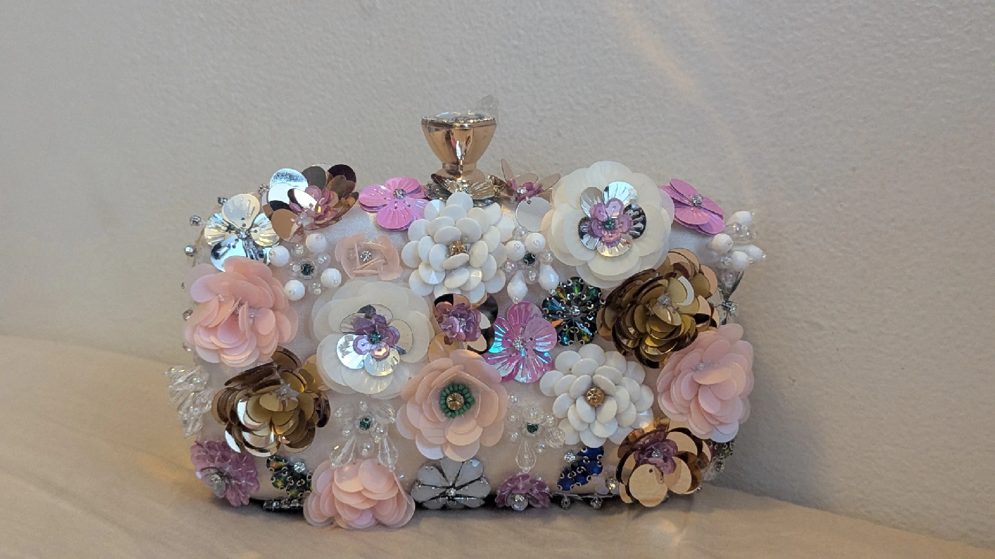 This is a lovely clutch purse, perfect for a special occasion! It's beautifully embellished with an array of flowers in shades of pink, white, and gold. The purse features a sparkling clasp and a metal handle. It also has an chain strap to convert to a sling. It's brand new in packaging, just not my style