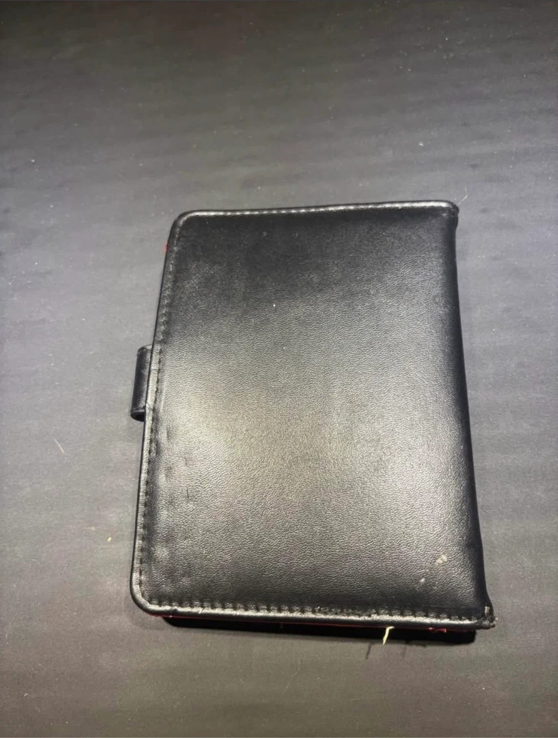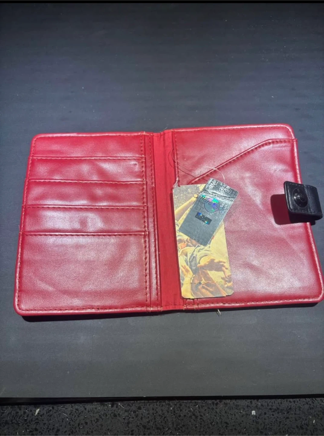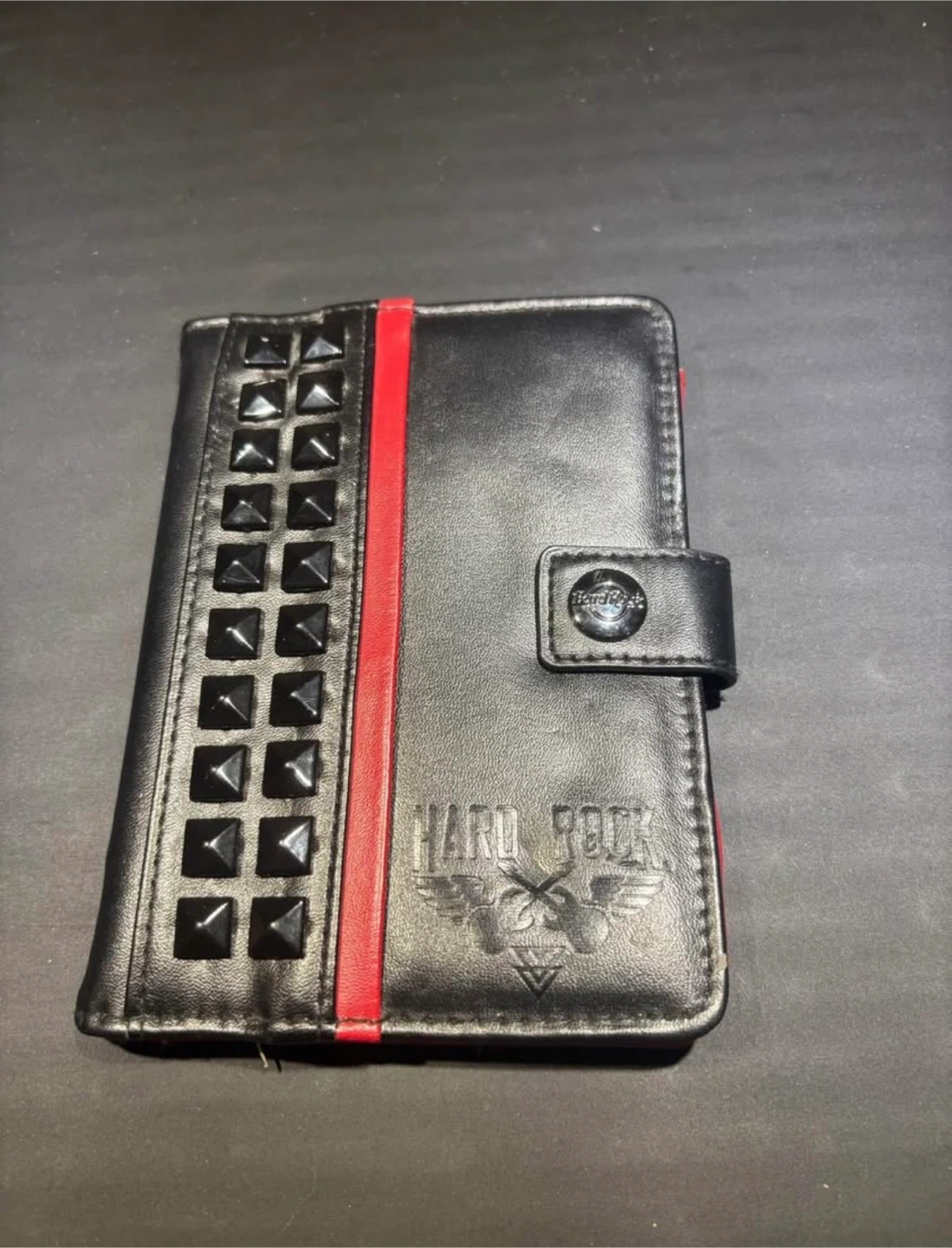 Selling a Hard Rock wallet! It's black leather with a red stripe and cool stud detailing. The inside is red. It has a snap closure. Feel free to ask any questions